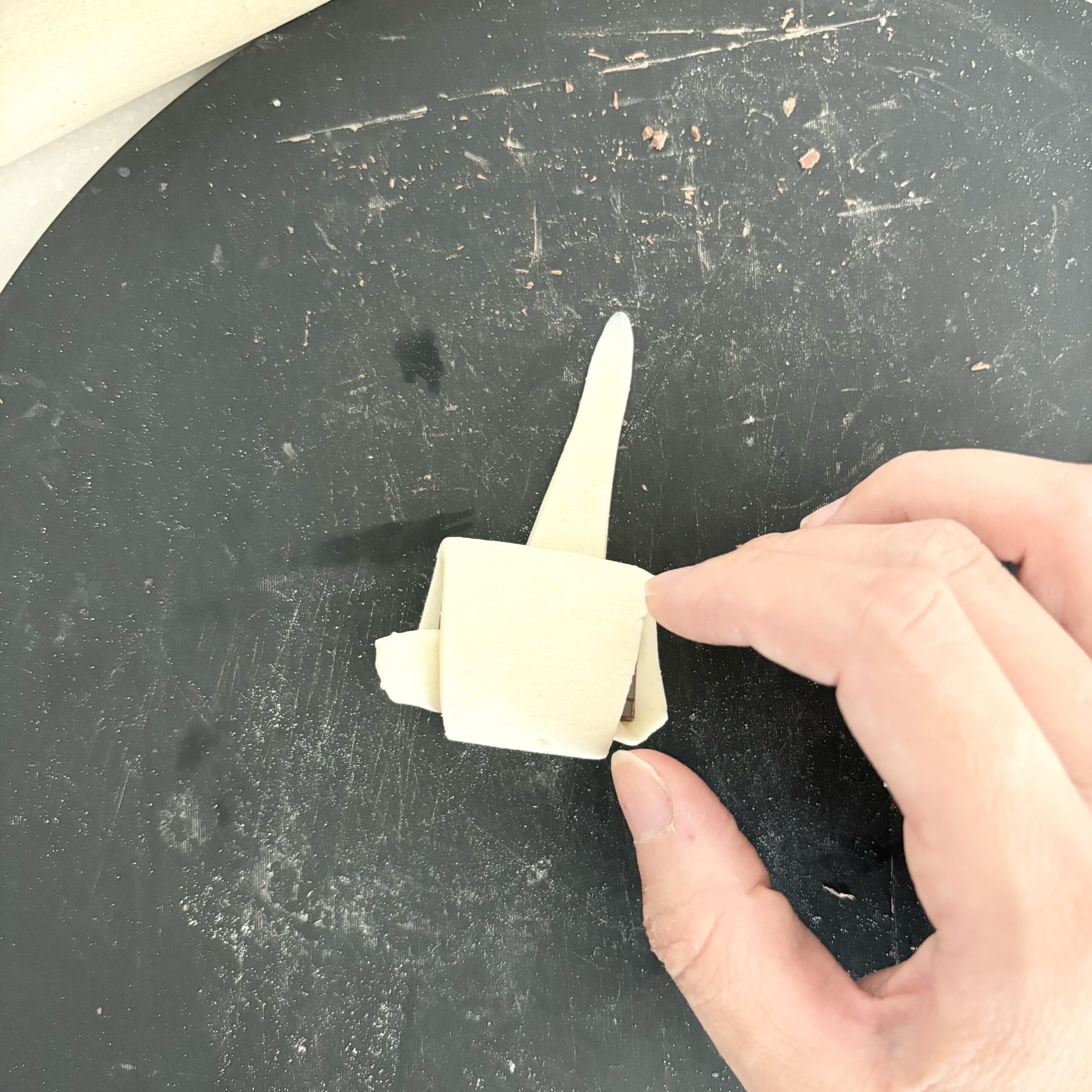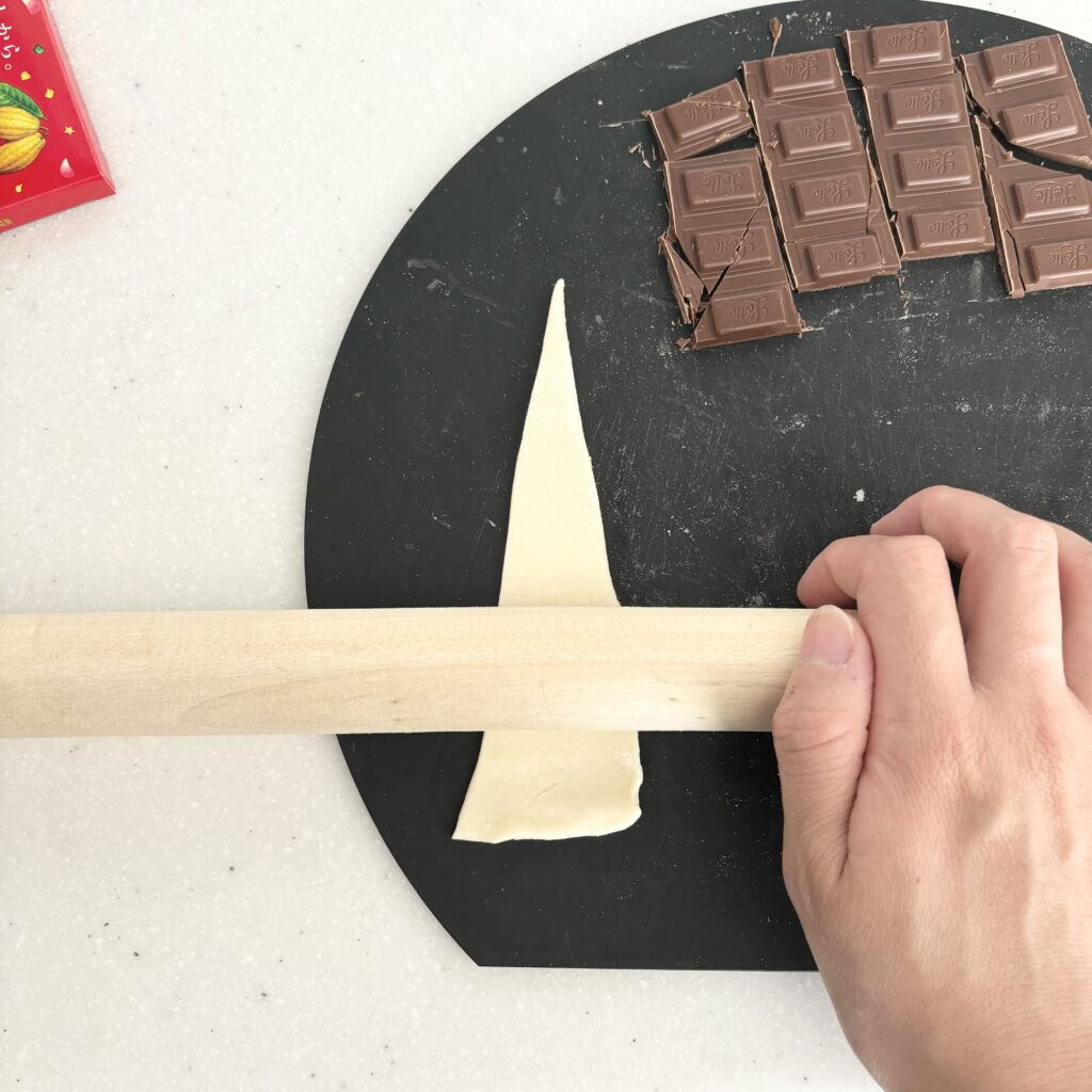 冷凍のパイシートを直角三角形に切り、麺棒で生地を伸ばします。