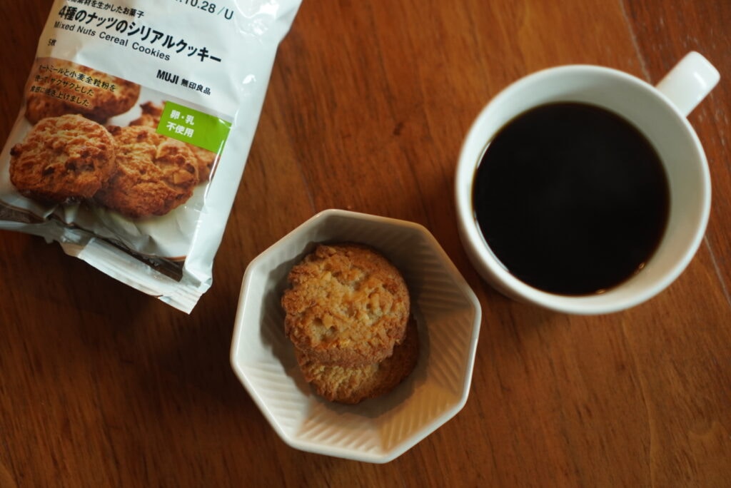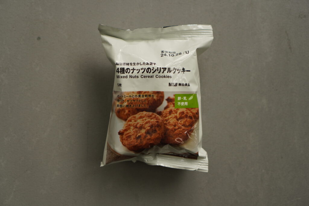 無印のお菓子は好きなものも多いですが、最近特に気に入っているのが、ザクザク食感が美味しい、4種のナッツのシリアルクッキー。