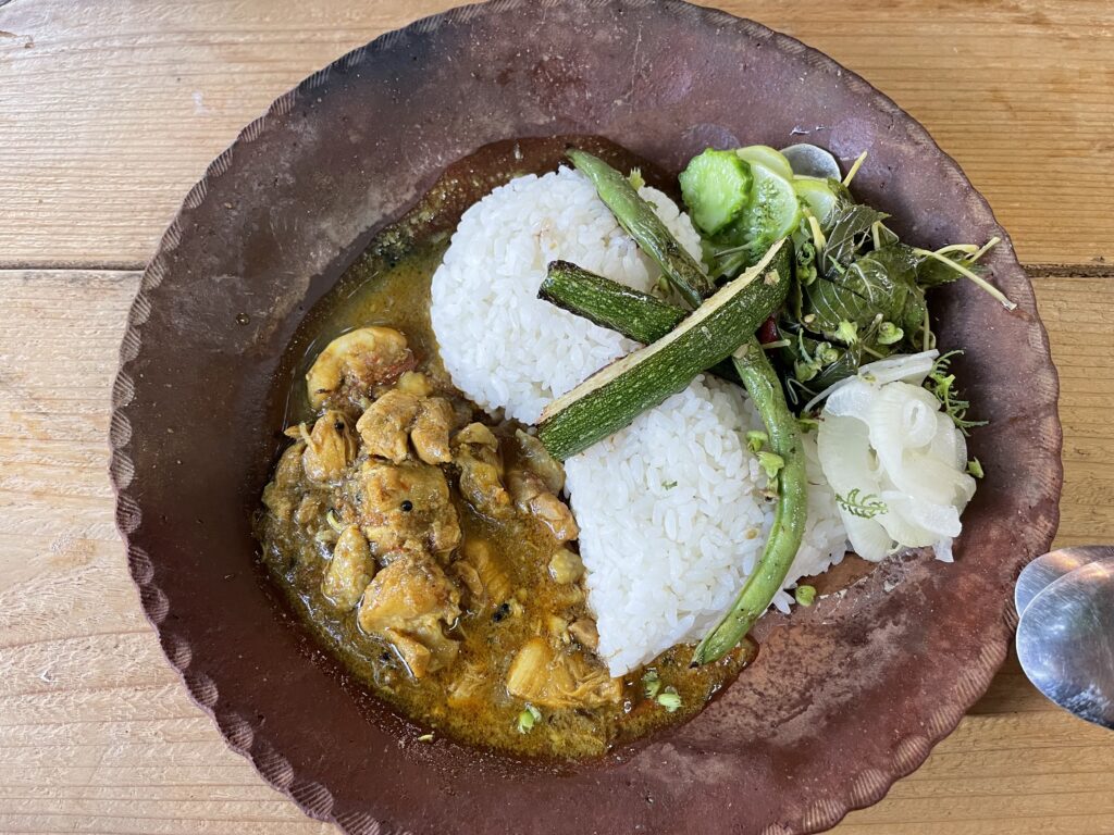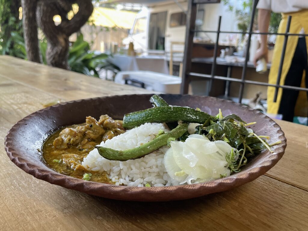 田中太郎さんが作陶された土器プレートに盛り付けされた、前方後円墳型にごはんが盛り付けされたキャッチーな見た目の「タナカリー」カレープレートがこちら。「太郎さんの土器に太郎さんが育てたお米、太郎さんのカレー、渉(伊藤渉氏。現在はミコト屋さんを卒業されています)の副菜、森本君の野菜 全部岐阜の恵み」とのこと…!