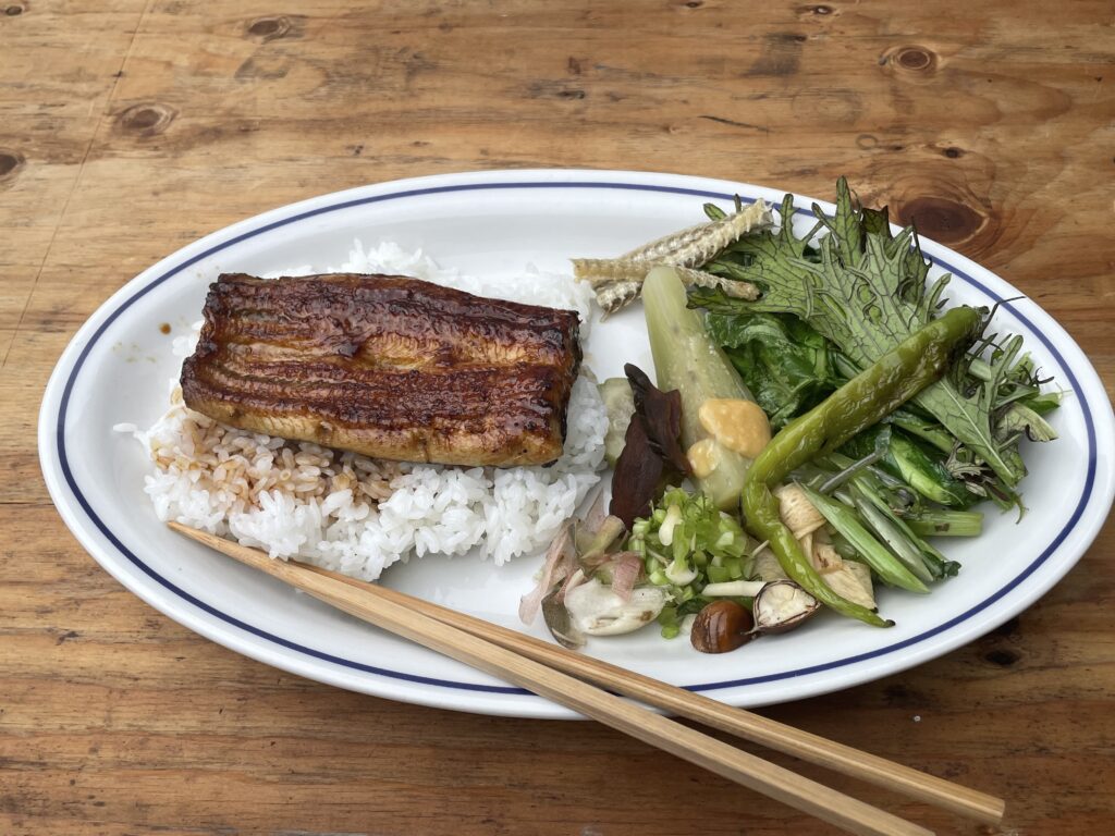 身が柔らかくて絶妙な焼き加減のフワフワ鰻の蒲焼き。秘伝のタレも相俟って、とっても美味しく頂きました!(お高いので夫婦2人で半分ずつ。)何と言ってもお米からお野菜まで、全ての食材が蒜山の自然栽培のお野菜・お米が使われているという贅沢プレートです。