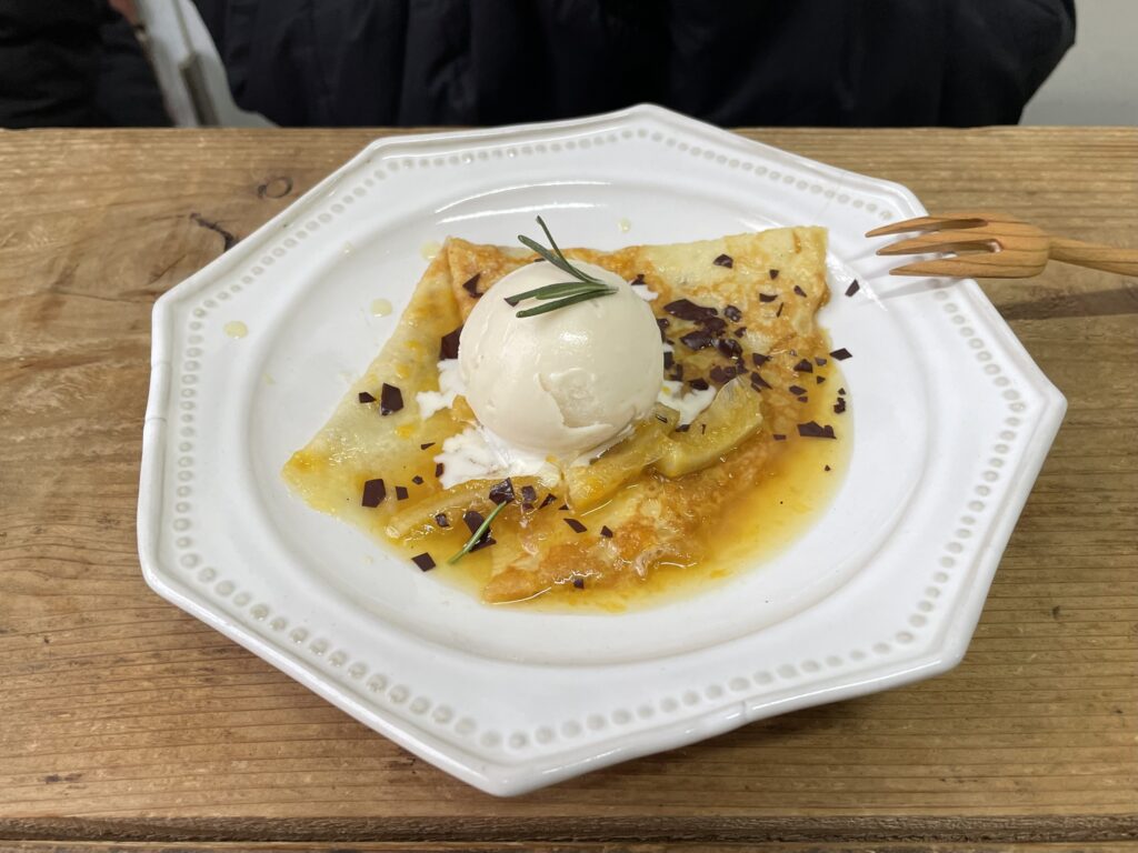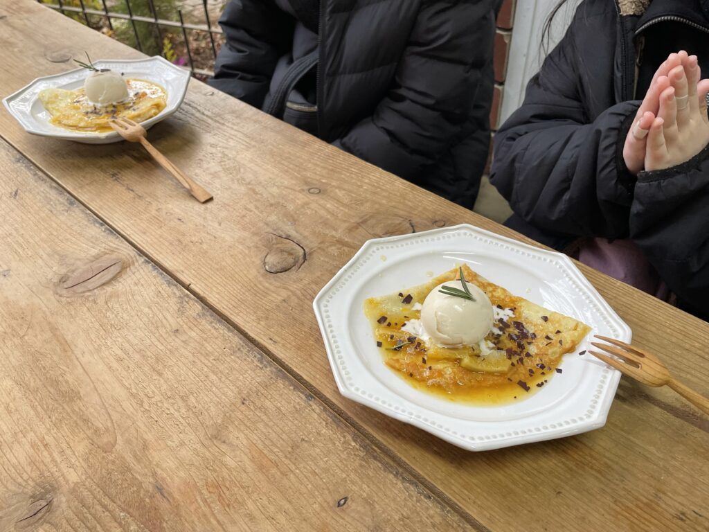 ロス野菜に手間と時間を加えて素晴らしいクラフトアイスを生み出すミコト屋さんのアイスクリームブランド“KIKI NATURAL ICECREAM”。この時季、アイスは敬遠してしまいそうですが…!熱々のクレープシュゼットや、ホカホカの焼き芋と一緒に頂くクラフトアイスは、また格別なんです。この日は長男(中2)・末っ娘(小2)・私…の3人でお邪魔しました。(次男(小5)は友達と遊んでいて不在)