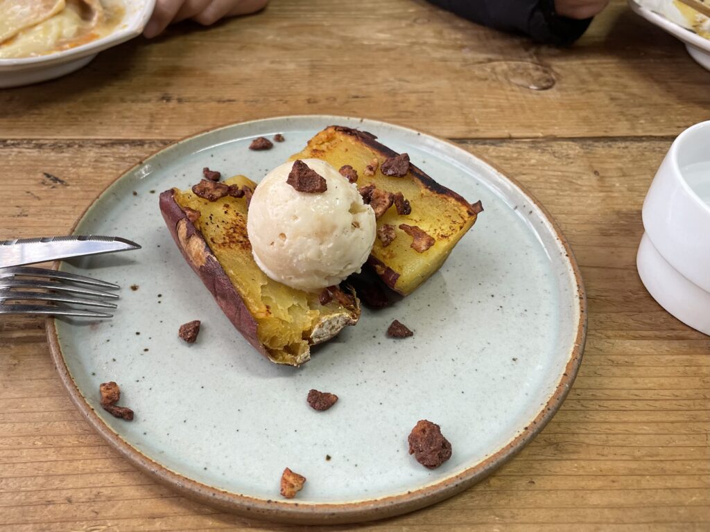 私は「焼き芋プレート」。糖度最高!な「紅はるか」を遠赤外線でじっくり焼いた、ねっとり甘い焼き芋に、クラフトアイスの種類は「あめ色たまねぎとしょうゆキャラメル」をセレクト!「じっくり炒め、コクのある甘さを引き出した玉ねぎ。深くなりすぎないよう作ったしょうゆキャラメルはどこかみたらし風。深味でかけ合わせた素材同士で強力なスクラムを組んでいます!!」というポップに惹かれました♡