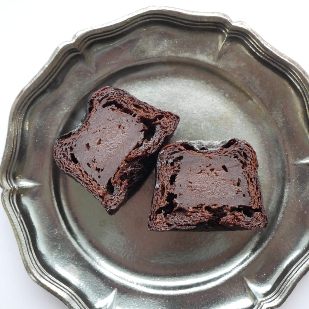 半分に切ってみるとこんな感じ。カヌレらしい空洞は少なめですが、その分濃厚なチョコと思わせるものがぎっしりと詰まっています。