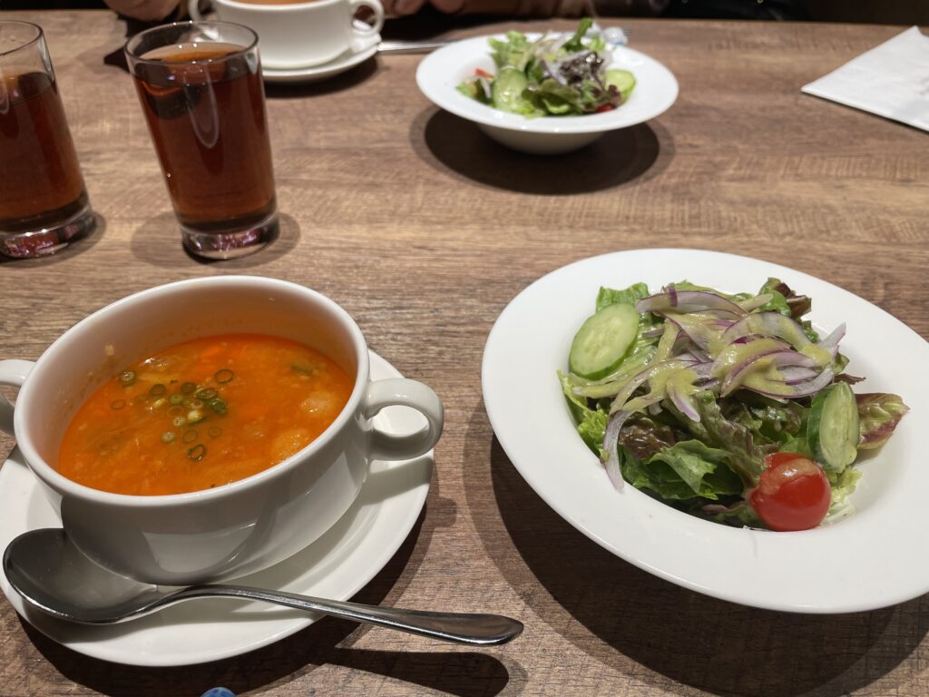 この日は、初めて訪れるハーバーグ専門店へ!ランチコースに付いて来る、グリーンサラダとパプリカのスープ。