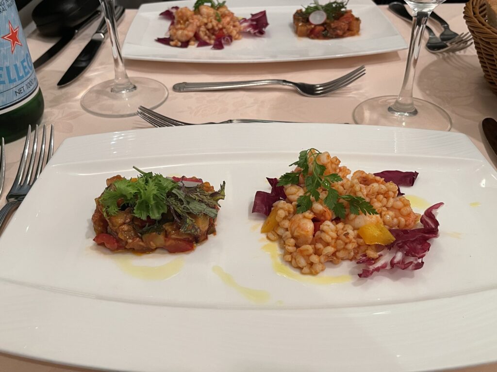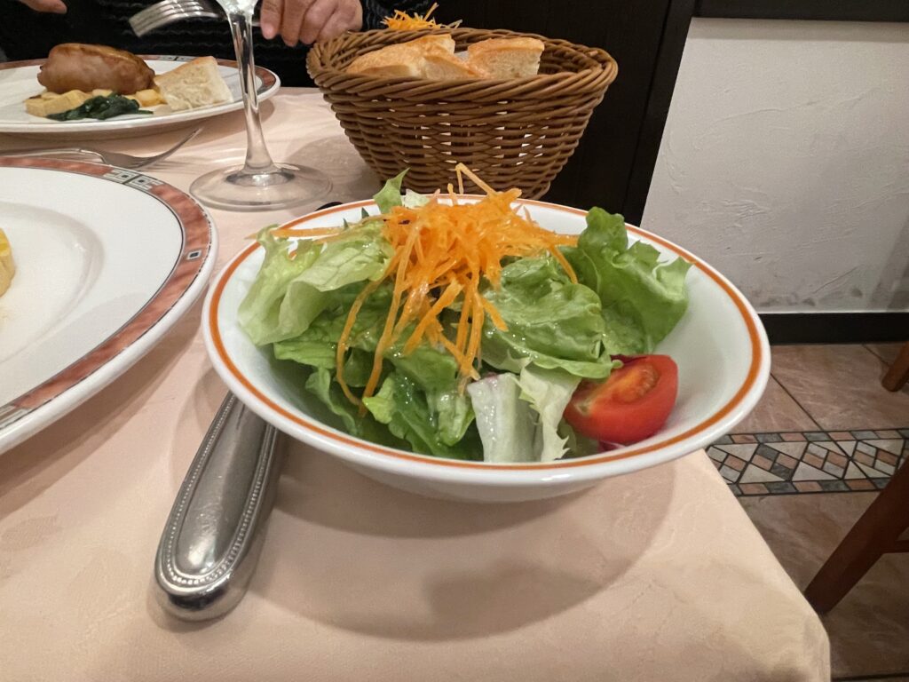 前菜はラタトゥイユと、小エビと押し麦のサラダ、グリーンサラダ。