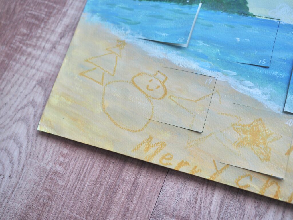 クリスマスっぽくもしたくなり、砂浜にクリスマスっぽい落書き、雲は星やサンタ帽のかたちを娘たちに描いてもらいました。