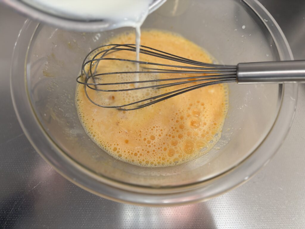 温めた牛乳と砂糖と卵を合わせます。