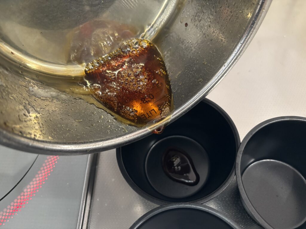 出来たカラメルを型に流し込んでおきます。
