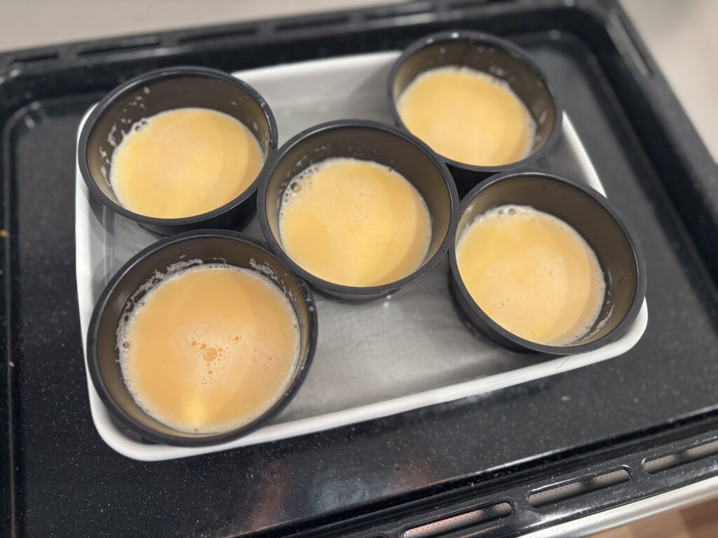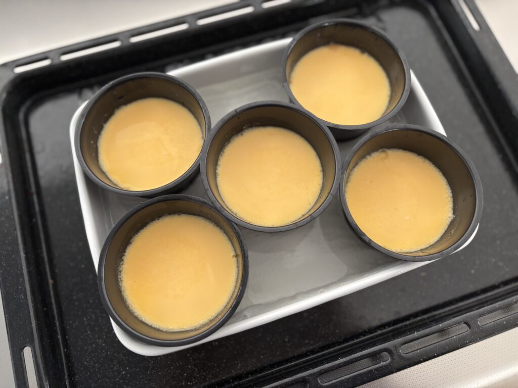 こした卵液を型にゆっくりと注ぎ入れて、お湯をはったバットに並べます。