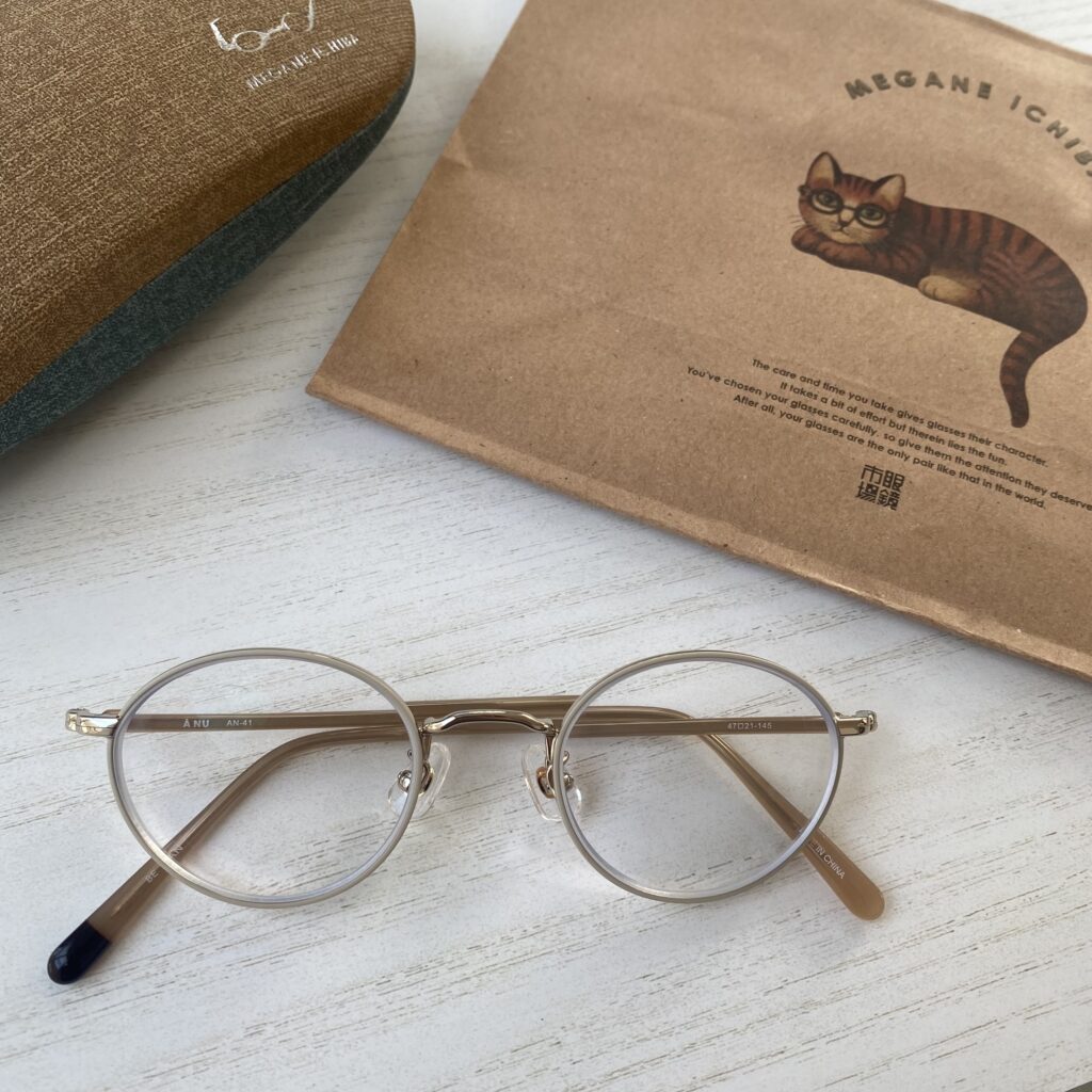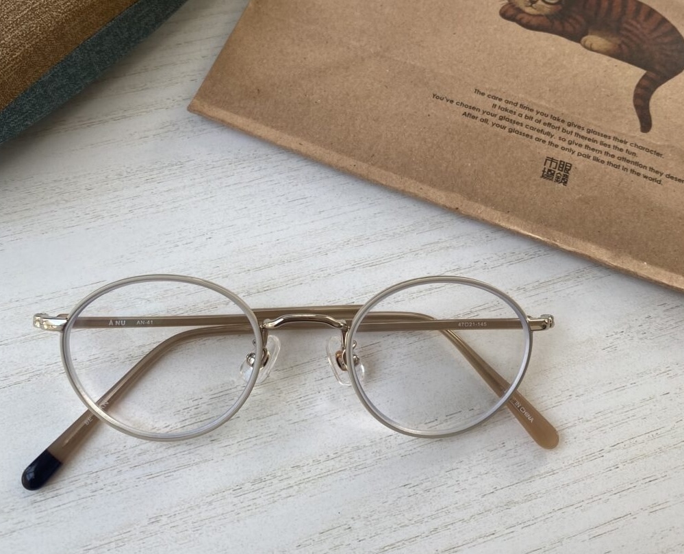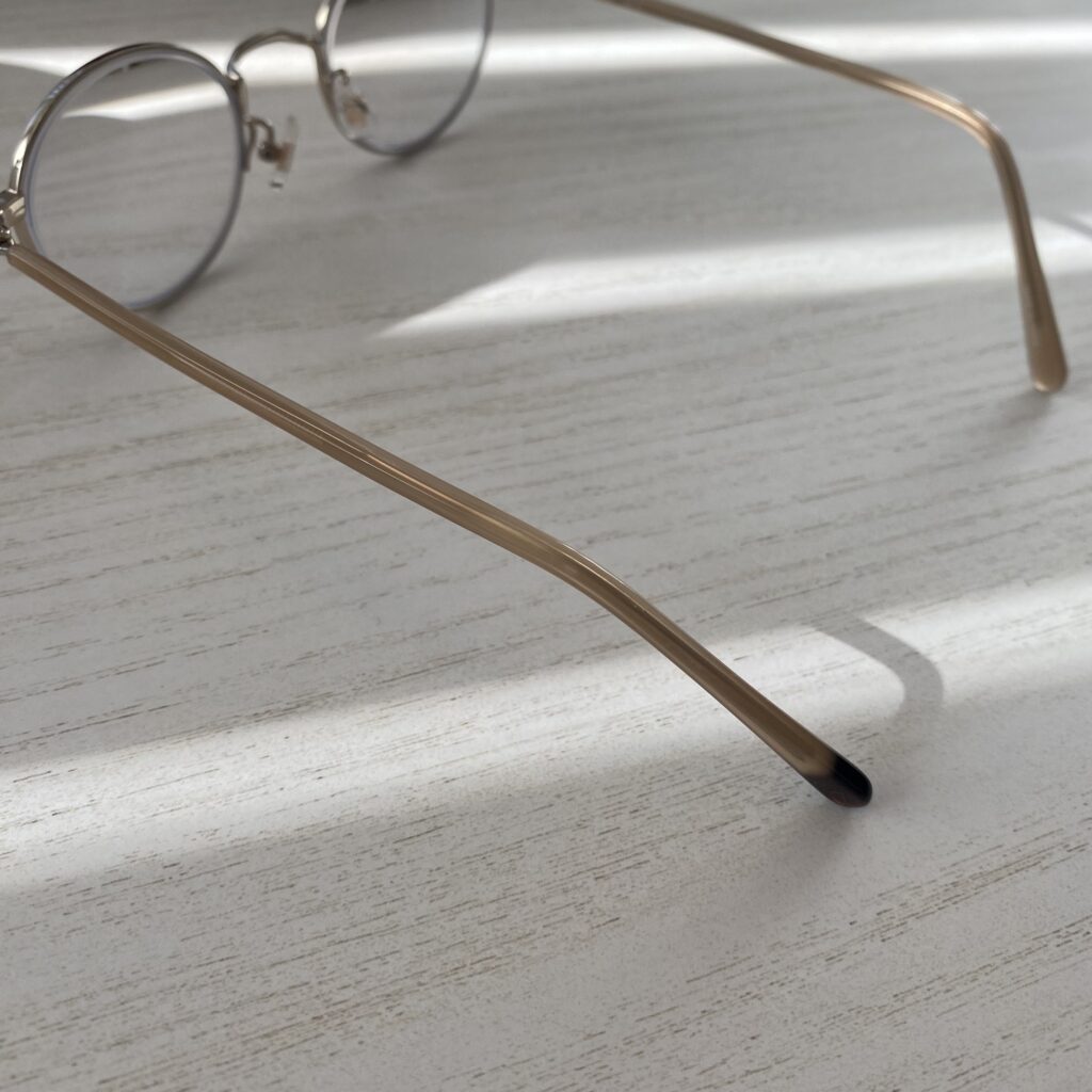 AN-41は角がない丸みを帯びたフレーム、また優しいベージュも相まって、メガネ単体で見ても柔らかい印象です。あたたかで落ち着いた雰囲気に惹かれ、こちらを選びました。