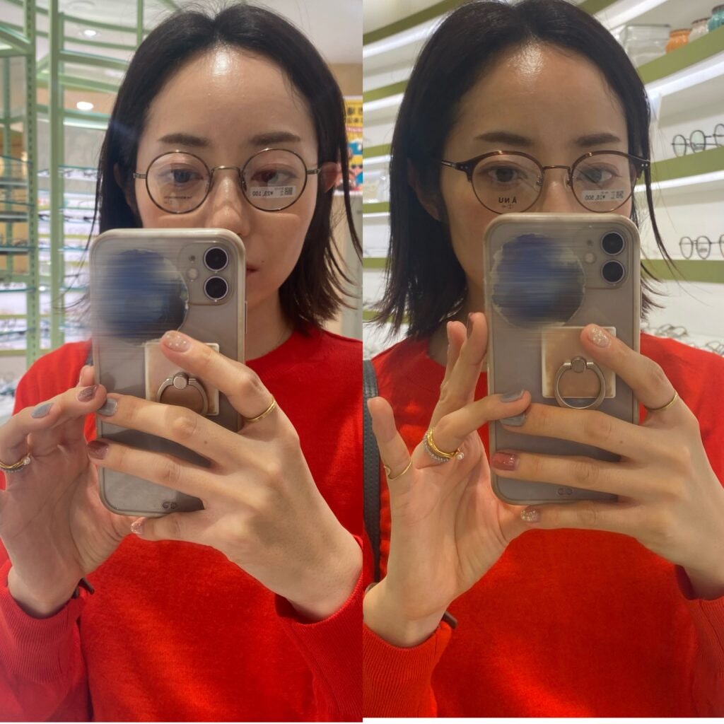 眼鏡市場の方からアドバイスいただいたように、目とレンズの距離が比較的近めの、余白が大きくならないようなフレームを選んだことで、メガネをかけたら目が小さく見える現象を抑えてくれました。また、このようなジャストサイズのメガネには他にもメリットがありました!
