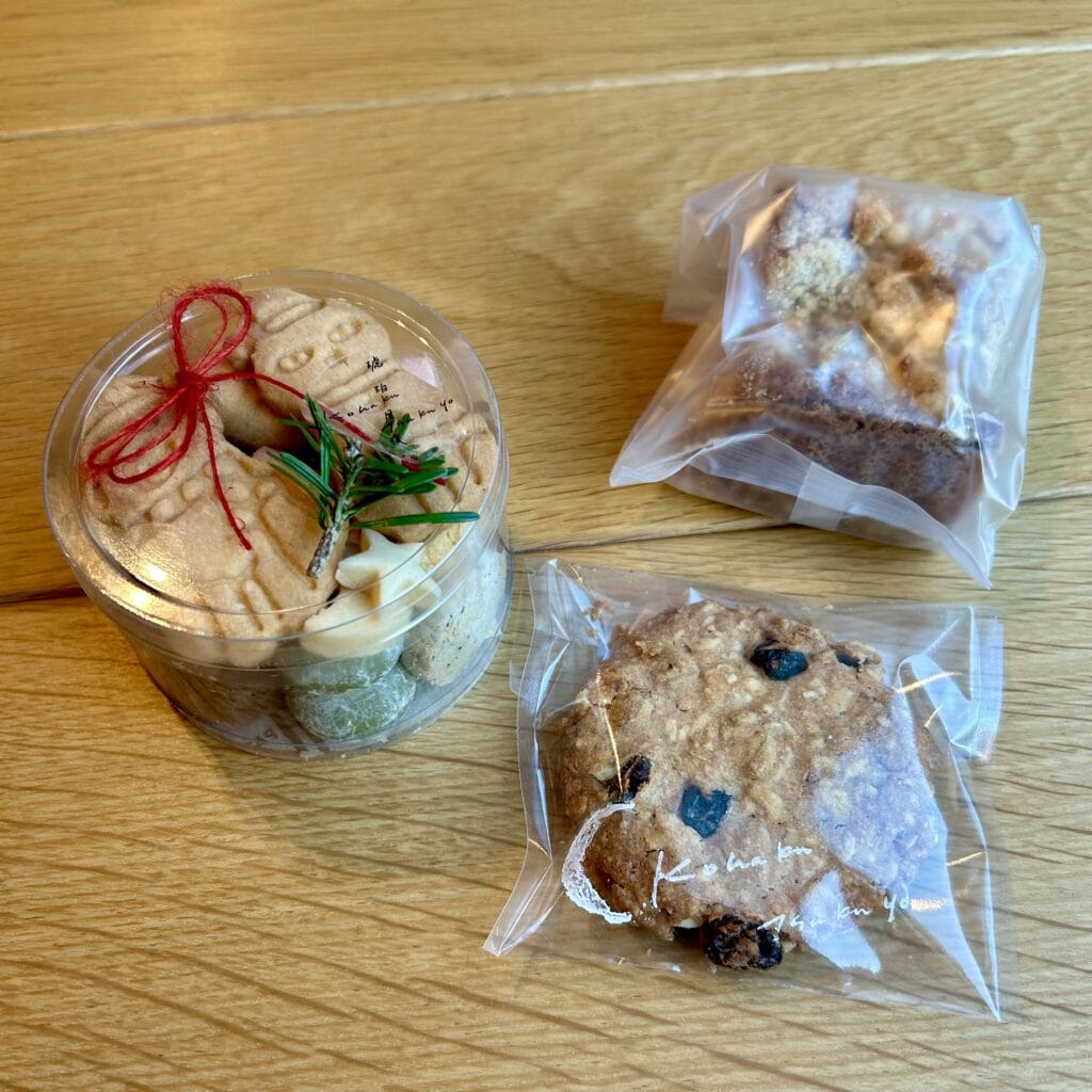クッキー詰め合わせは見た目の可愛さだけでなく、サクサク・ほろほろでとっても美味しいです。お隣は上が「りんごとクリームチーズ」下が「オートミールクッキー(レーズンとブルーベリー)」です。