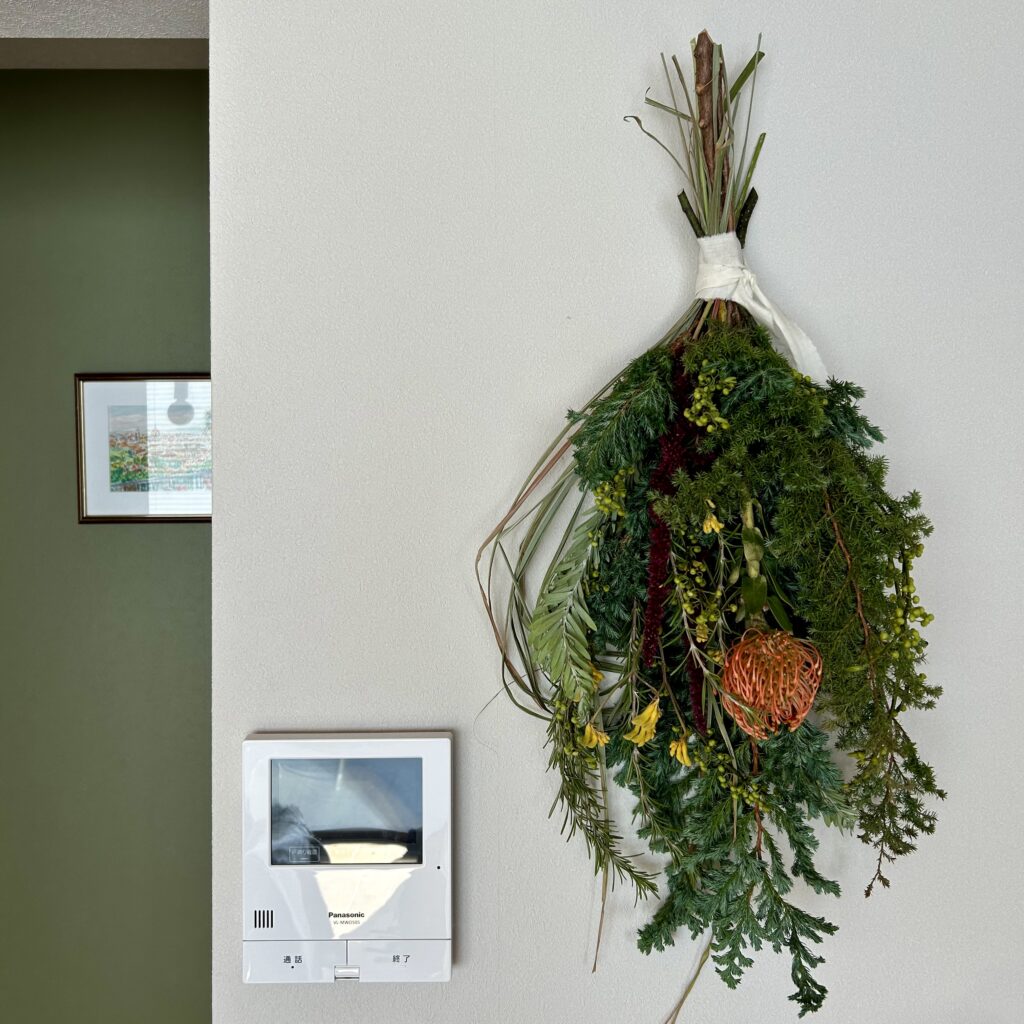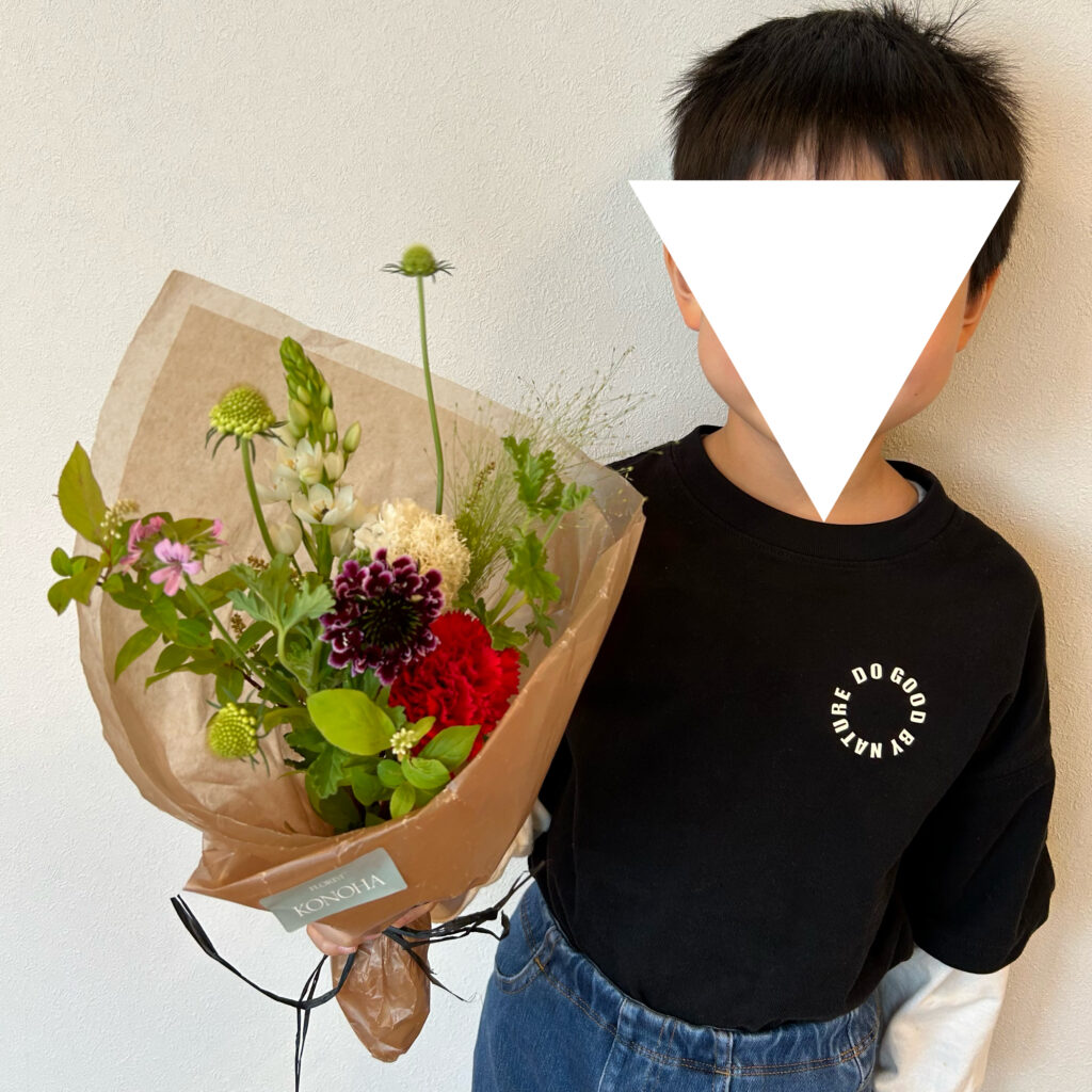 KONOHAさん。大好きなお花屋さんです。自宅を新築した際にリースをオーダーしたり、母の還暦祝に赤いリースをお願いしたり、はたまた母の日には息子をこちらのお店に連れ込んだりと。。。w 植物本来の美しさを引き出すアレンジ、センスがとっても好きです。本当は小ぶりなスワッグを購入しようとしていたのですが、息子とともに一目惚れしたこちらを持ち帰り^^