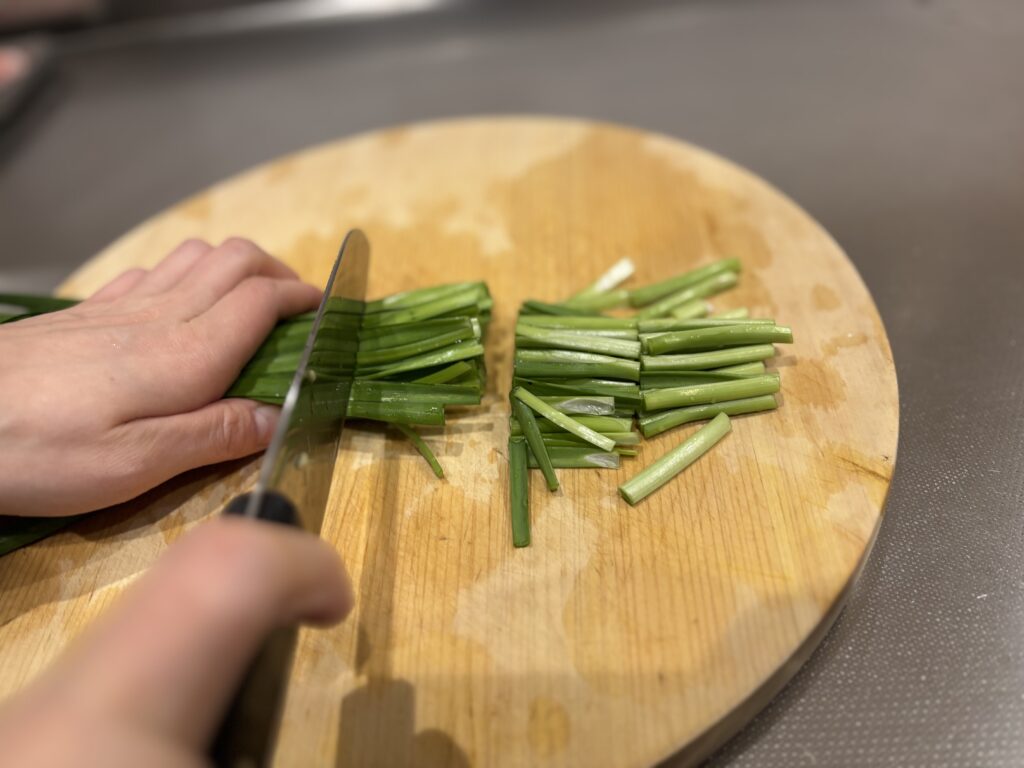 私は子どもも食べやすいようにニラは5cmくらいのサイズにカットしました。