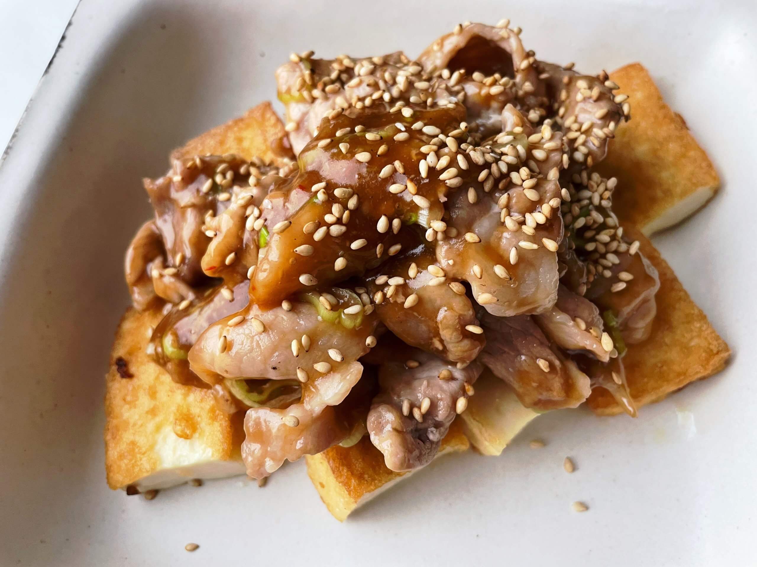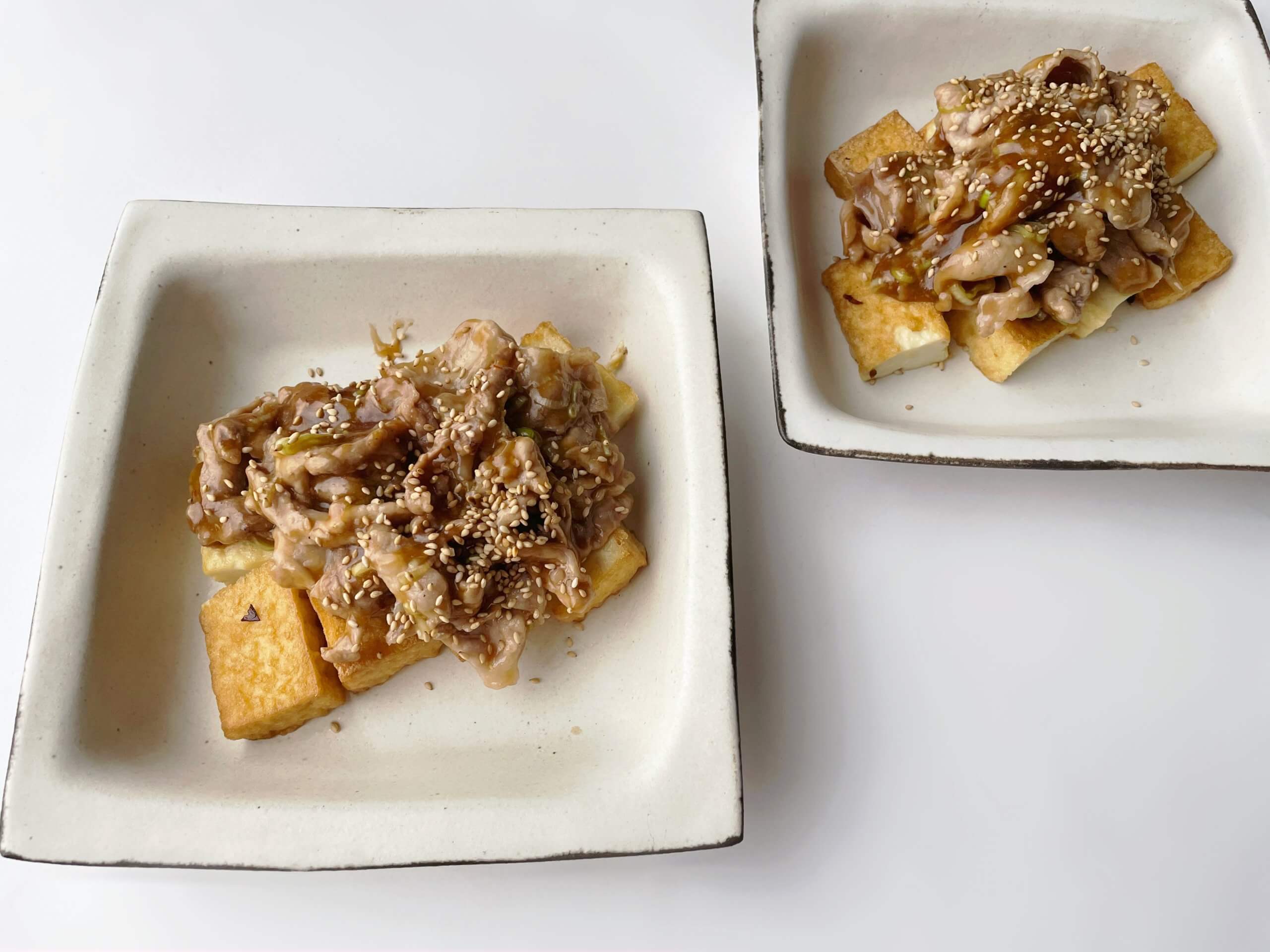 厚揚げをカリッと焼いて、照り照りの豚こまをのせるだけなんですが、ボリューミーで満足感のあるおかずです。