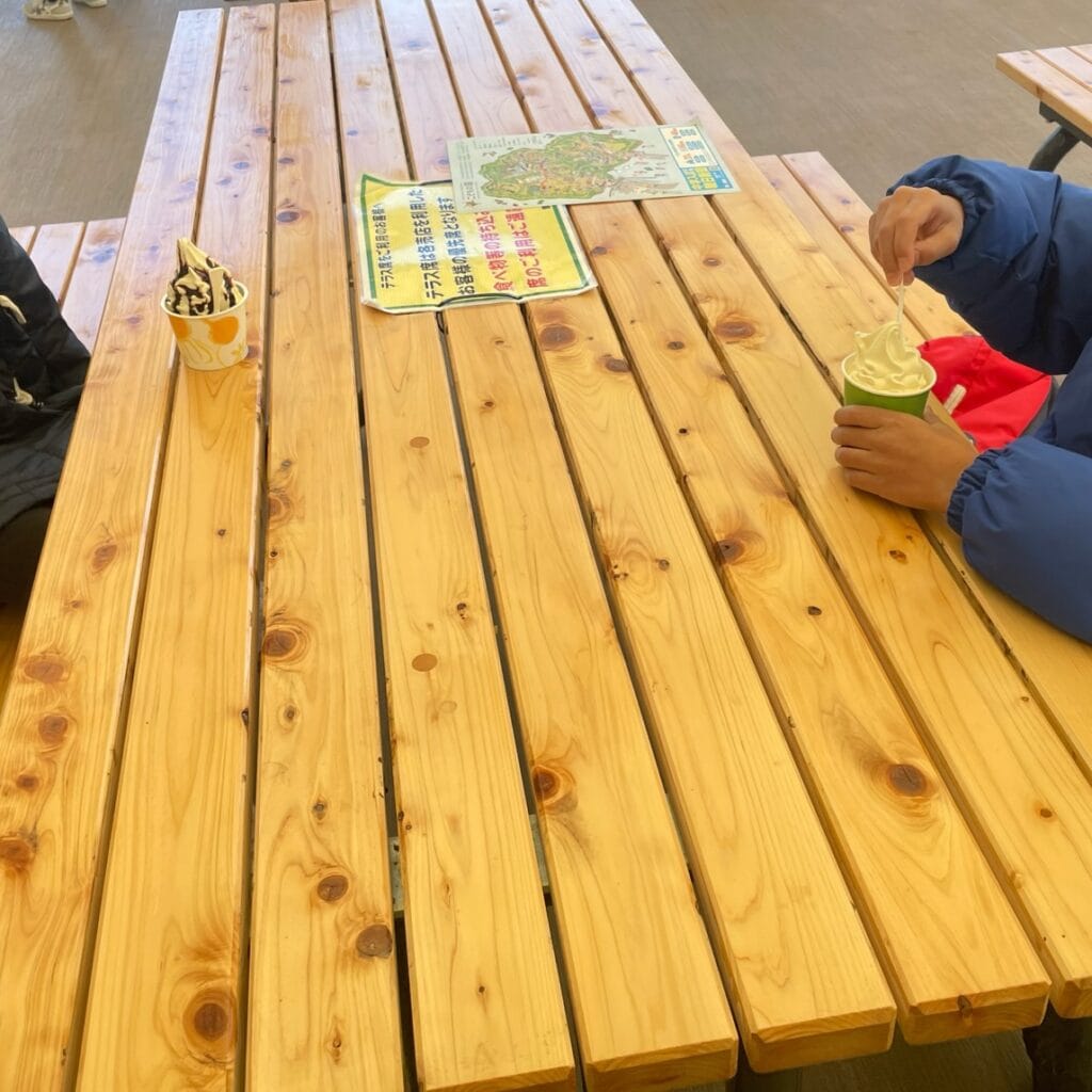 「少し戻ってミルクプラントでソフトクリーム食べる?」(チャレンジサイクルで疲れた母、座りたい)と聞いたら