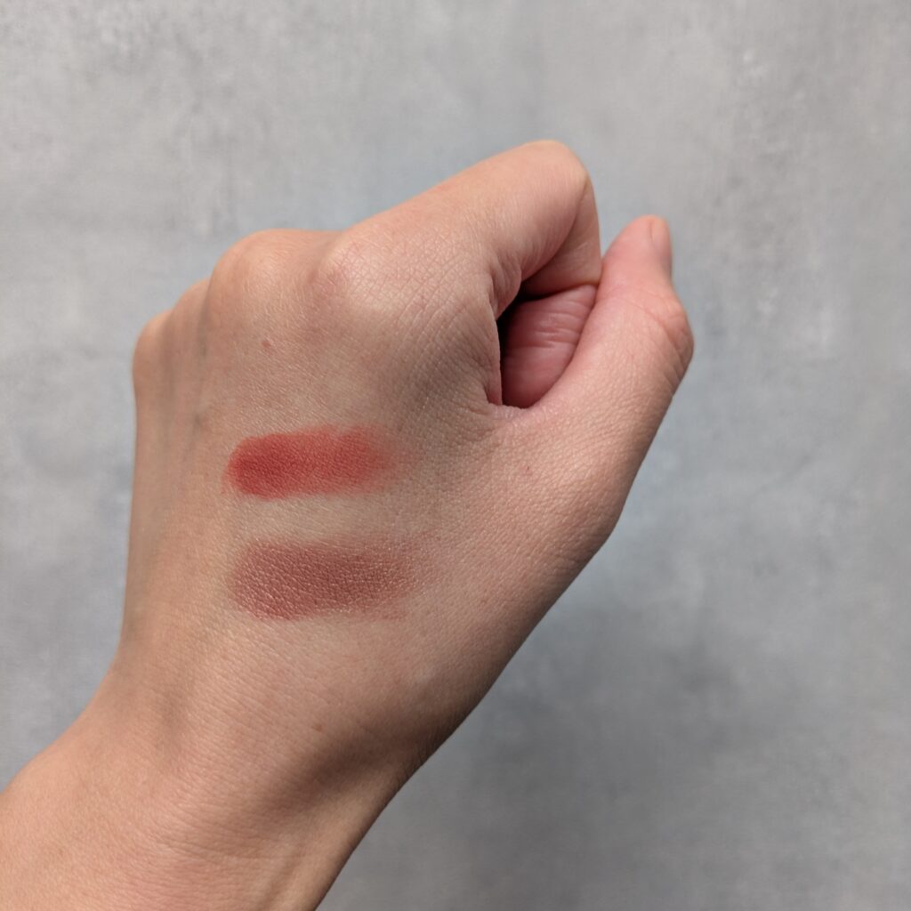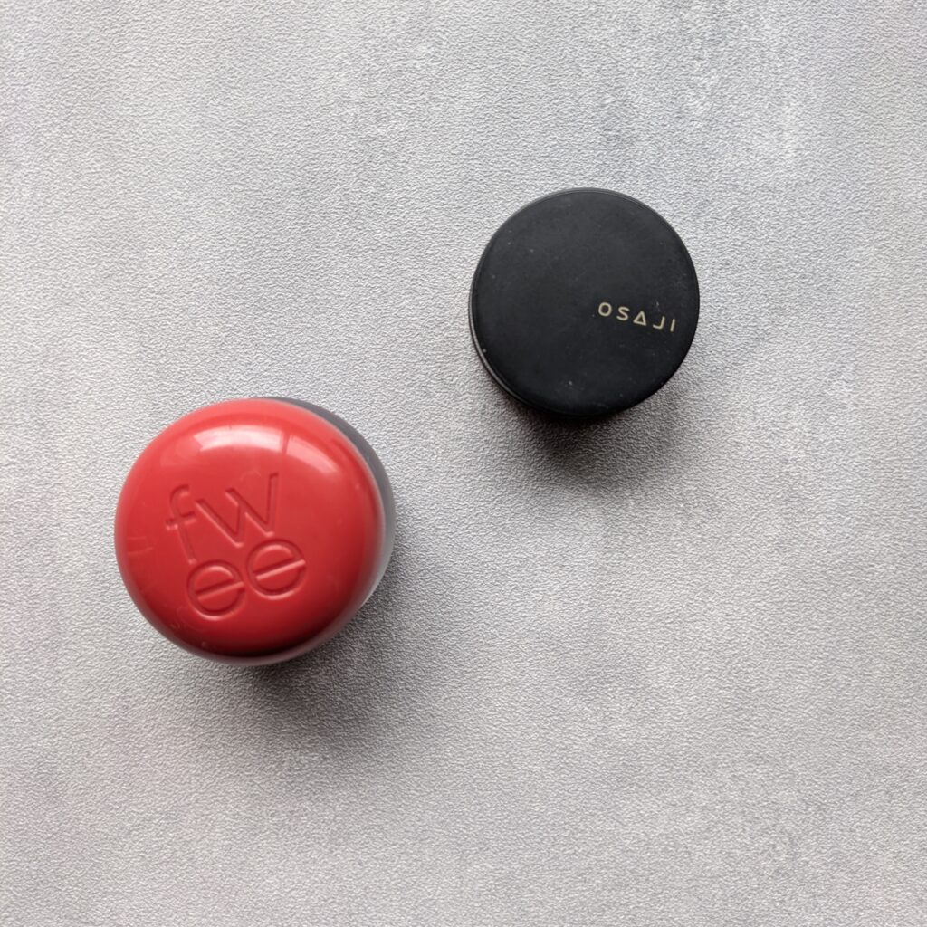 わたしの肌色と好みの問題だと思いますが、ブラウンベースのレッド系(OSAJI)とオレンジ系(fwee)があれば雰囲気の違うメイクも楽しめて大満足。