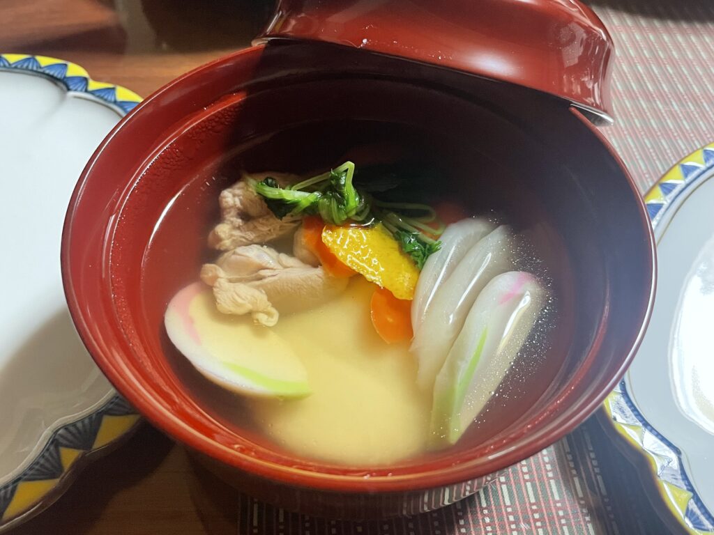 私が鯛の昆布締めが大好きなのを知ってくれていて、鯛の昆布締めも作っていてくれました…(涙)。お雑煮はおすましです。