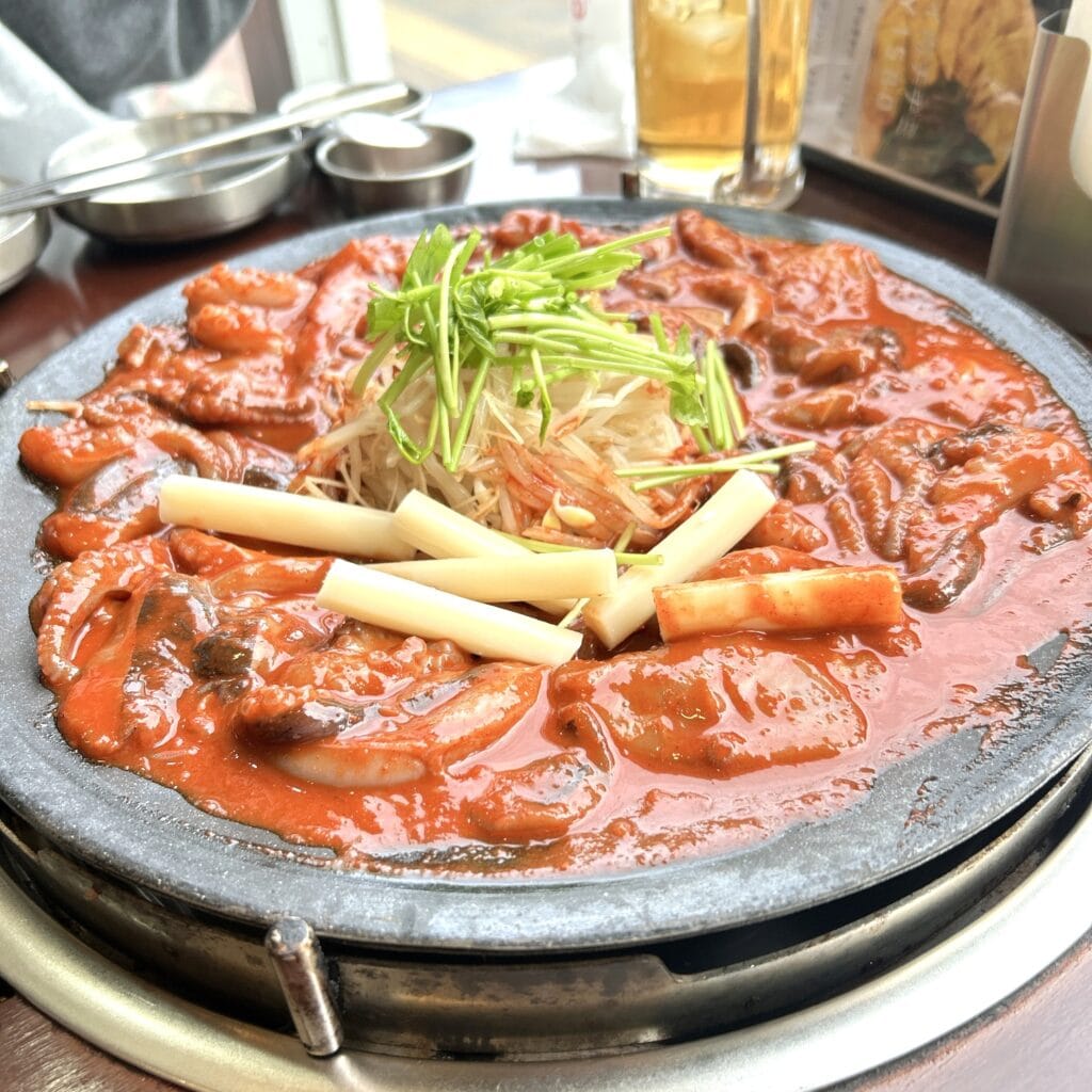 オーダーしたのは看板メニューのオリジナルチュクミ。びっくりしたのがチュクミ店というだけあって、チュクミを基本としてコプチャン(ホルモン)やサムギョプサルがセットになった鍋しかメニューにはありませんでした!一品料理はケランチムとお肉がメインで入っているチヂミくらい。韓国は専門店的なお店が普通なので「〇〇を食べに行く」というスタイルが基本。メインの料理以外あまりないことは珍しくはないです。(日本だとイタリアン、フレンチ、中華…と料理の系統を決めて食べに行くことが多いですが、韓国だとタッカンマリ、サムギョプサル、ヘムルタンなど料理を選んで食べに行く感じ)