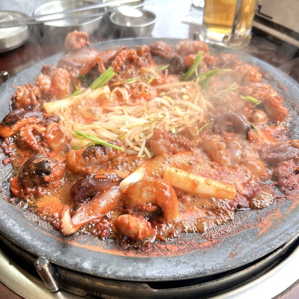 チュクミ=小さいタコ(イイダコ)なのでそれを想像していましたが、ここは普通のタコをぶつ切りにしたもの。お兄さんが調理してくれて、食べ頃を教えてくれます。韓国料理って店員さんが作ってくれるものが多くて、それもなんだかいいですよね♪出来上がっていく過程も見れるので楽しい。