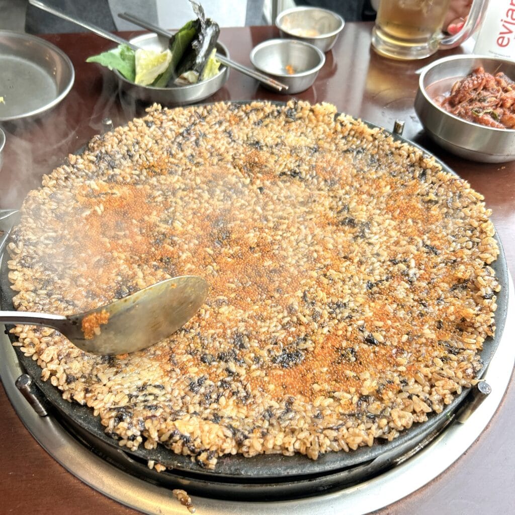 タコの旨味が染み出したソースにご飯、韓国のり、とびっこが混ざって、もう最高!としか表現できない美味しさ。おこげもまた美味しい。韓国のスプーンで鉄板からそぎ落としながら食べるのもまた醍醐味。とびっこのぷちぷち感が楽しい食感で、スプーンが止まらない。1人前でしっかり量があったので、人数マイナス1くらいで頼むのをおすすめします。