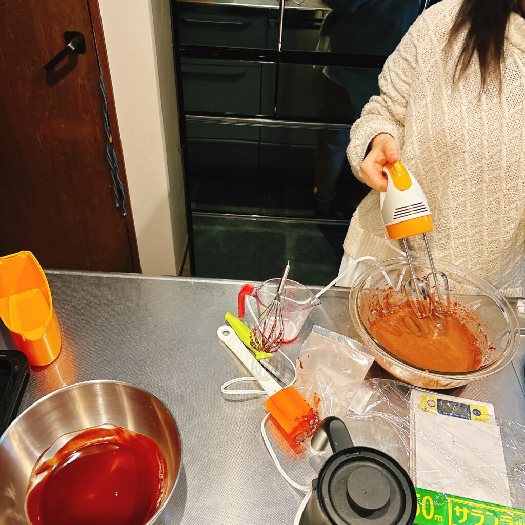 材料をダマにならないように混ぜて〜。
