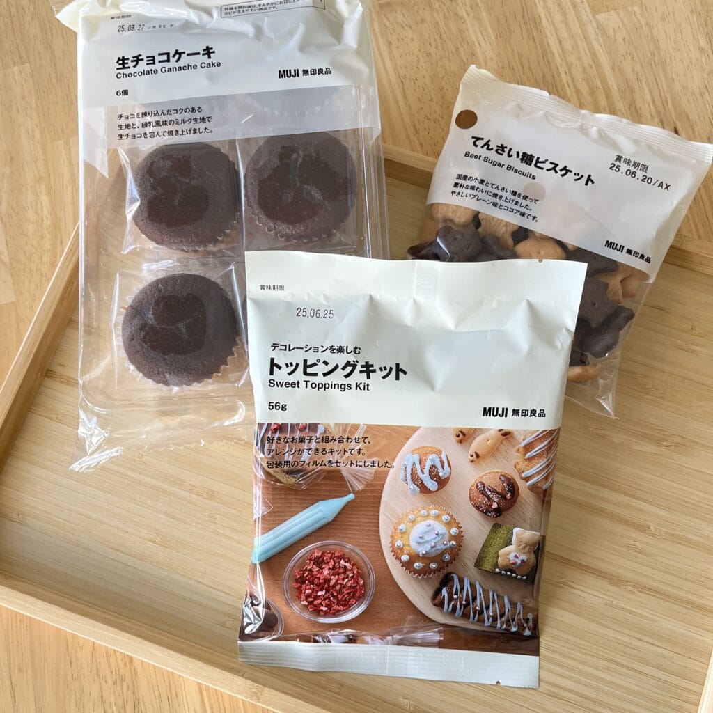 使用したのは「トッピングキット」、「生チョコケーキ」、そして「てんさい糖ビスケット」。ビスケットは素朴な味と愛らしいクマの形がお気に入りで、普段からよく購入しています。