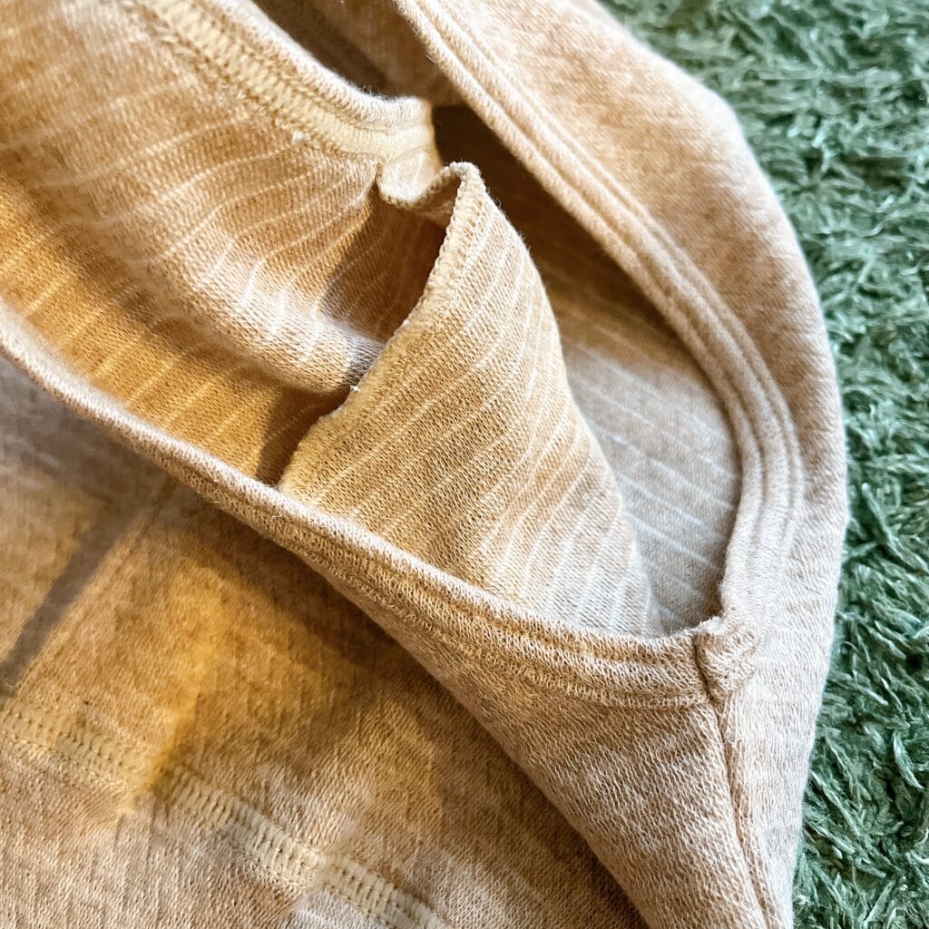 日本製で、素材はコットン65%(オーガニックコットン)、カシミヤ20%、絹15%(ワイルドシルク)とのこと。中性洗剤で手洗い推奨ですが、ネットに入れて中性洗剤で洗濯可能とのことなのでお手入れがしやすそうで購入しました。