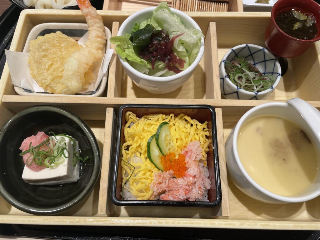 天麩羅や茶碗蒸し、牛肉のしぐれ煮、とびこ&蟹ちらしなど相変わらずのボリュームで高コスパな松花堂弁当ランチ。