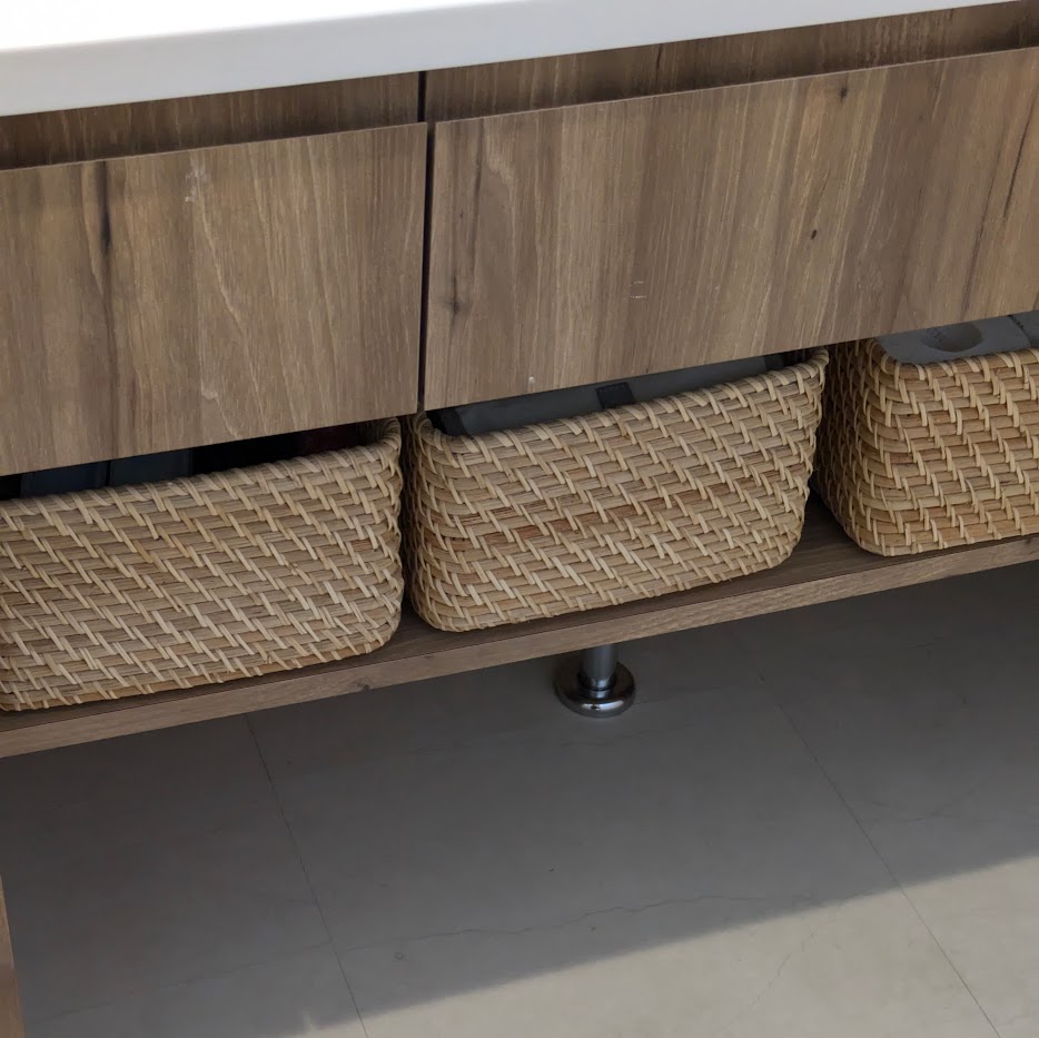 ※子供が取り出しやすいように、現在はカゴ一つなくして、モリスの布で目隠しています。