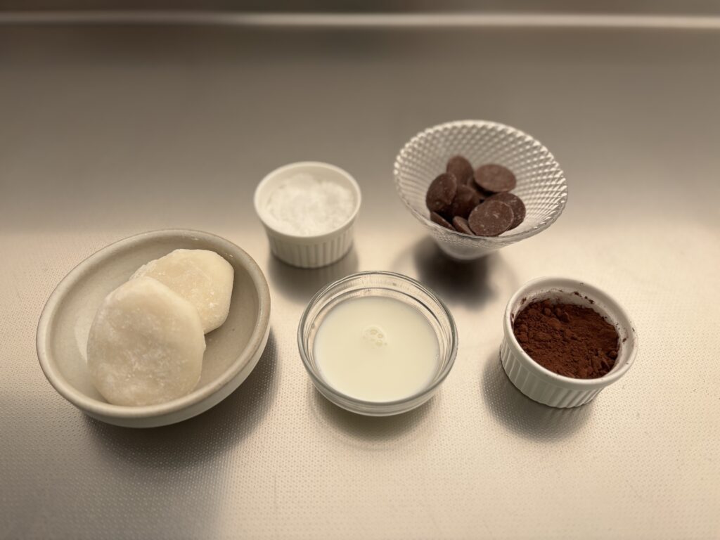 余ったお餅、チョコレート、牛乳、砂糖、ココアパウダー、ナッツの6つ。