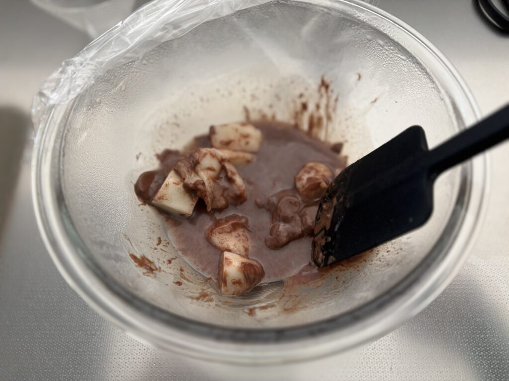 チョコレートがある程度溶けたら再度レンジで加熱していきます。