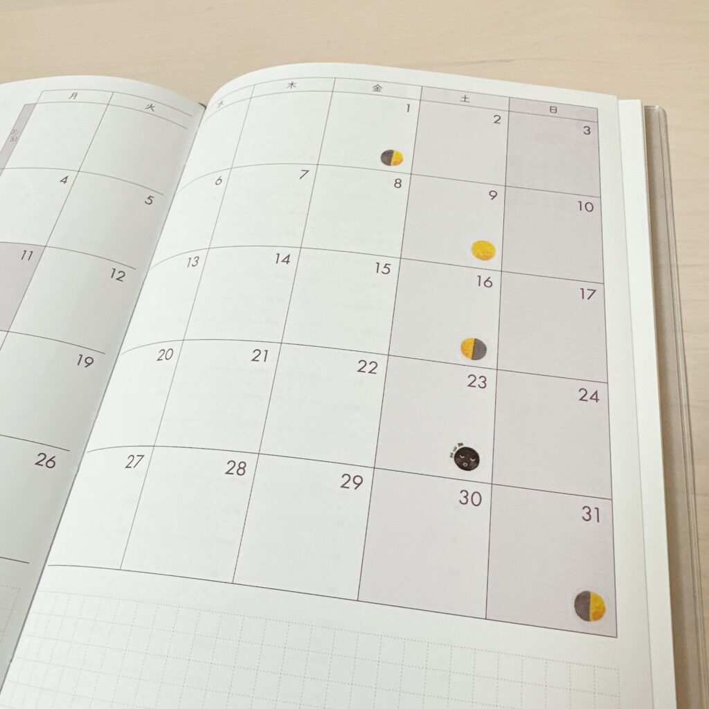 ウィークリーページに何種類も貼ってしまうとゴチャゴチャしてしまいそうなので、月の満ち欠けシールはマンスリーページに貼ってみました。