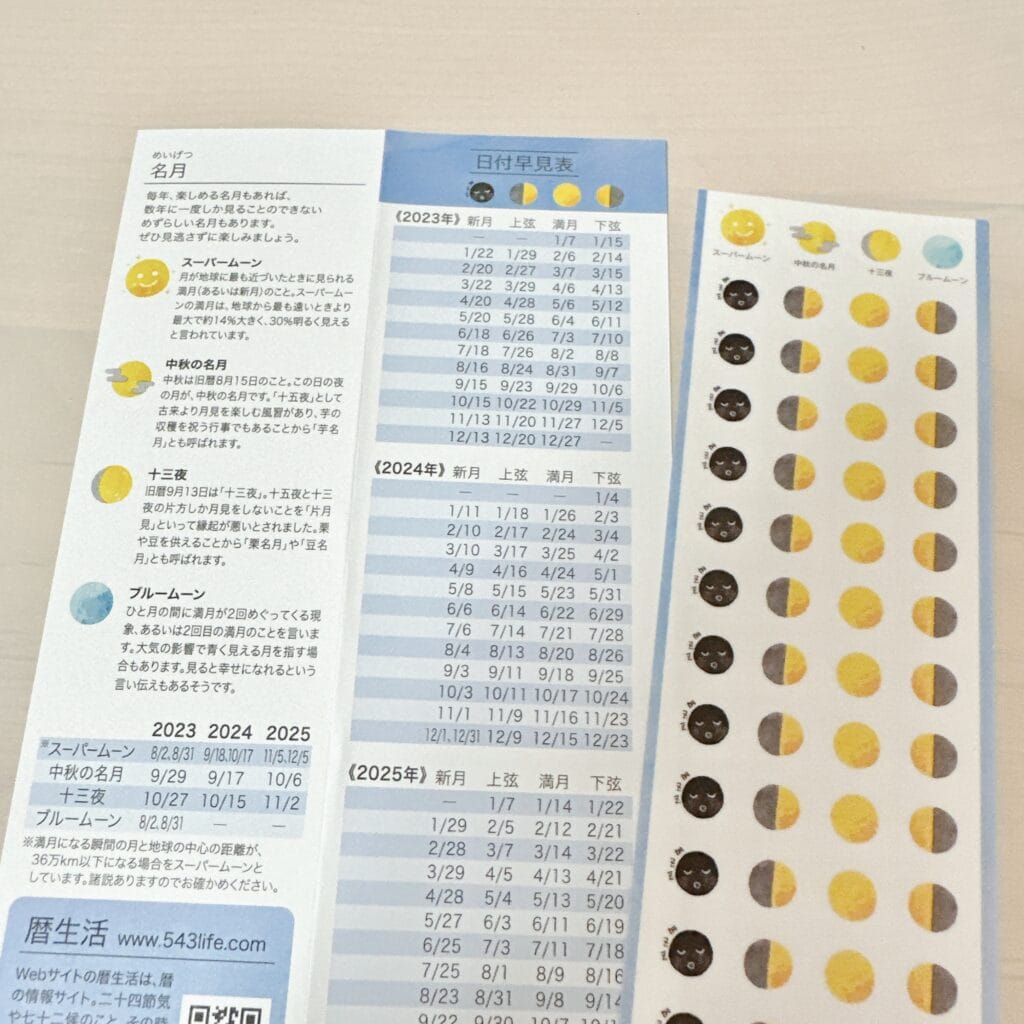 こちらのシールには、2025年の新月・上弦・満月・下弦の日付早見表と、スーパームーン・中秋の名月・十三夜・ブルームーンの解説と日付一覧が付いています。