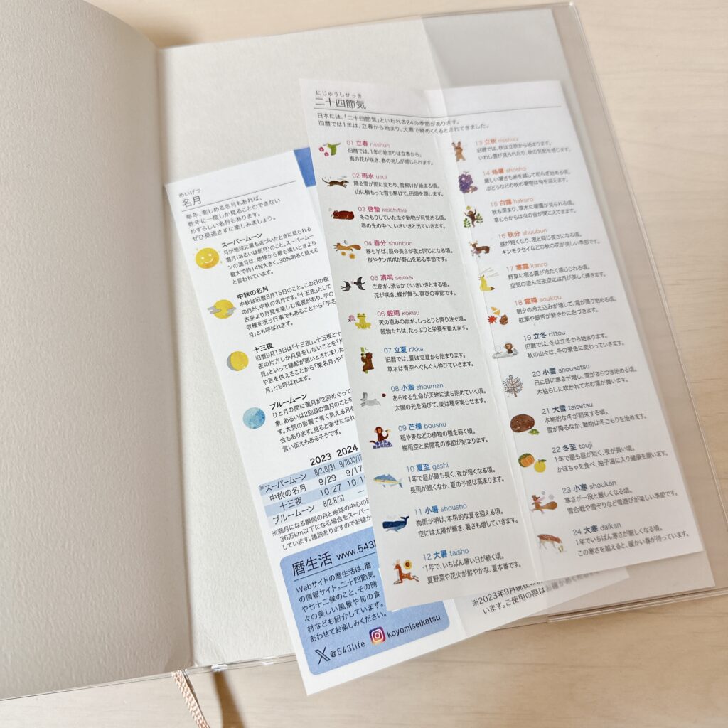 内容としては、かわいいイラストが添えられた、24つの節気+5つの節句シールと、読み方と簡単な解説が書かれたリーフレット、日付早見表が入っています。