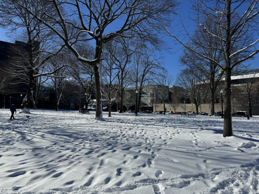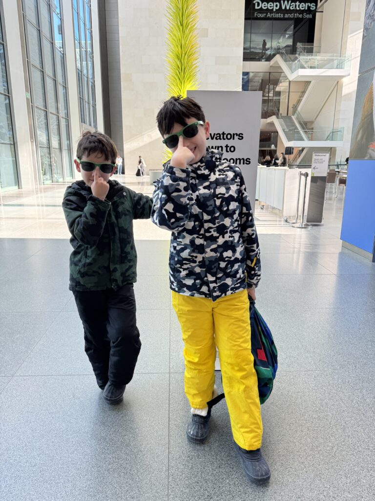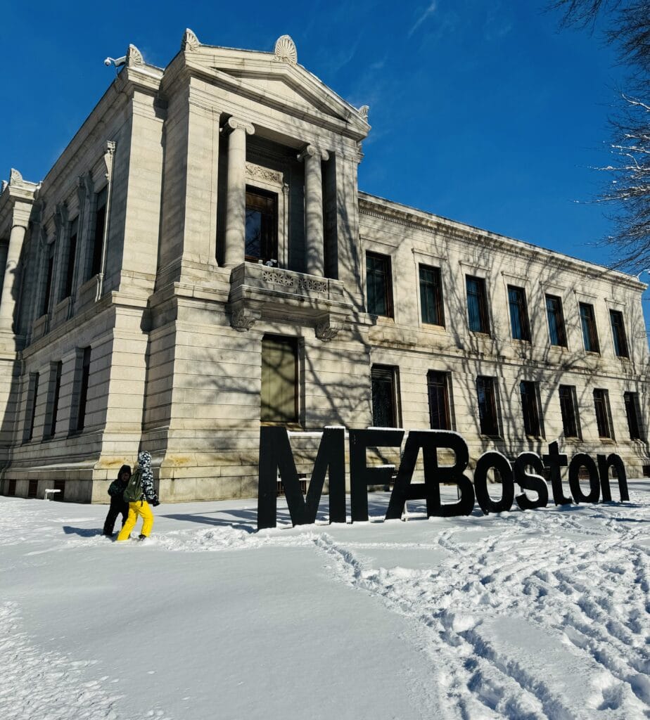 まずは先着順で入場できるボストン美術館へ。開館前から並ぶ間、キッズは積もった雪の上を転がりまわるためスキーウェアでのお出かけになります😉 開館時刻と同時にココアが振る舞われます。凍えた手と体に染み渡ります。が、入り口の荷物チェックで全ての水分を廃棄。ココアも😓。