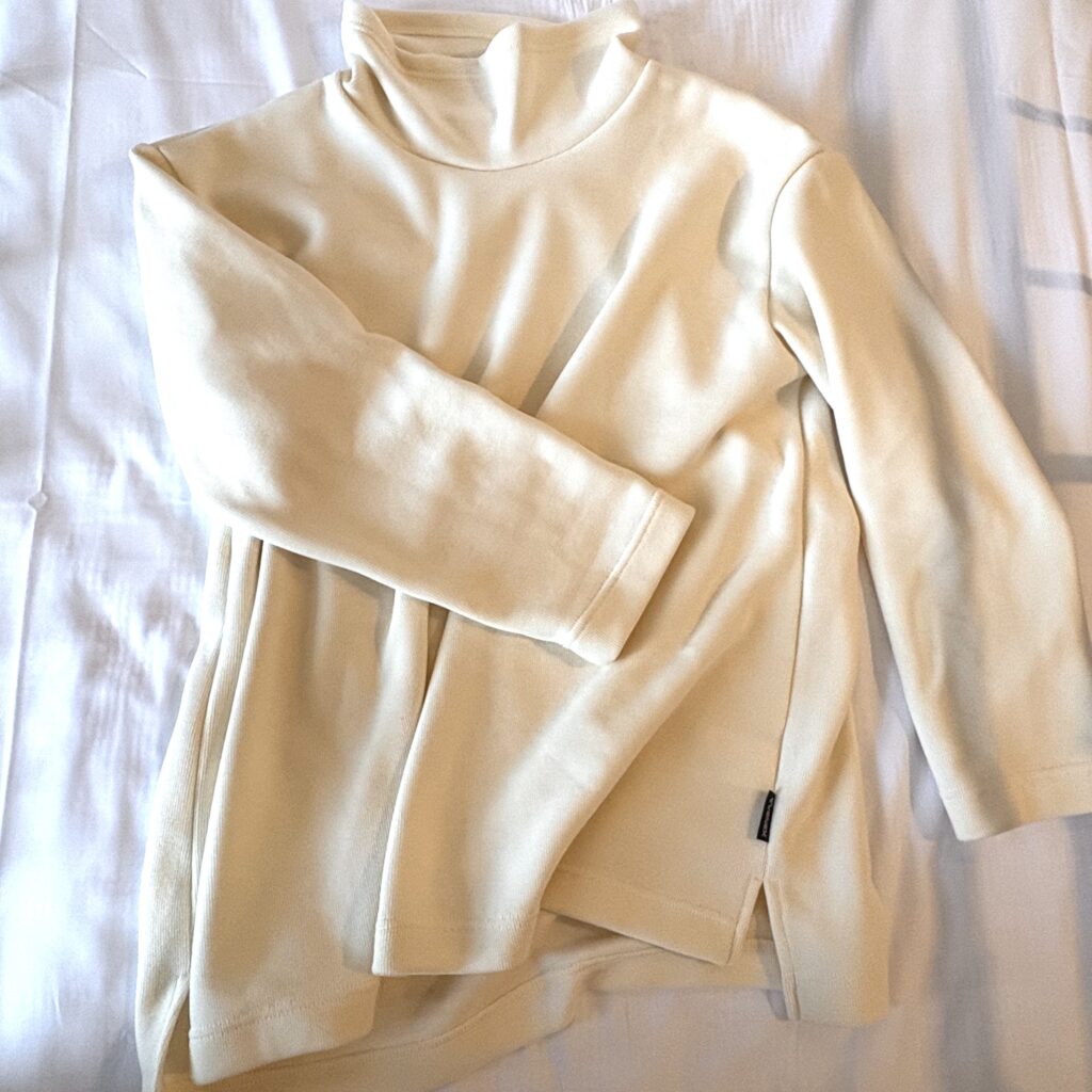 タートルネックのトップスと、テーパードパンツの上下セットです。