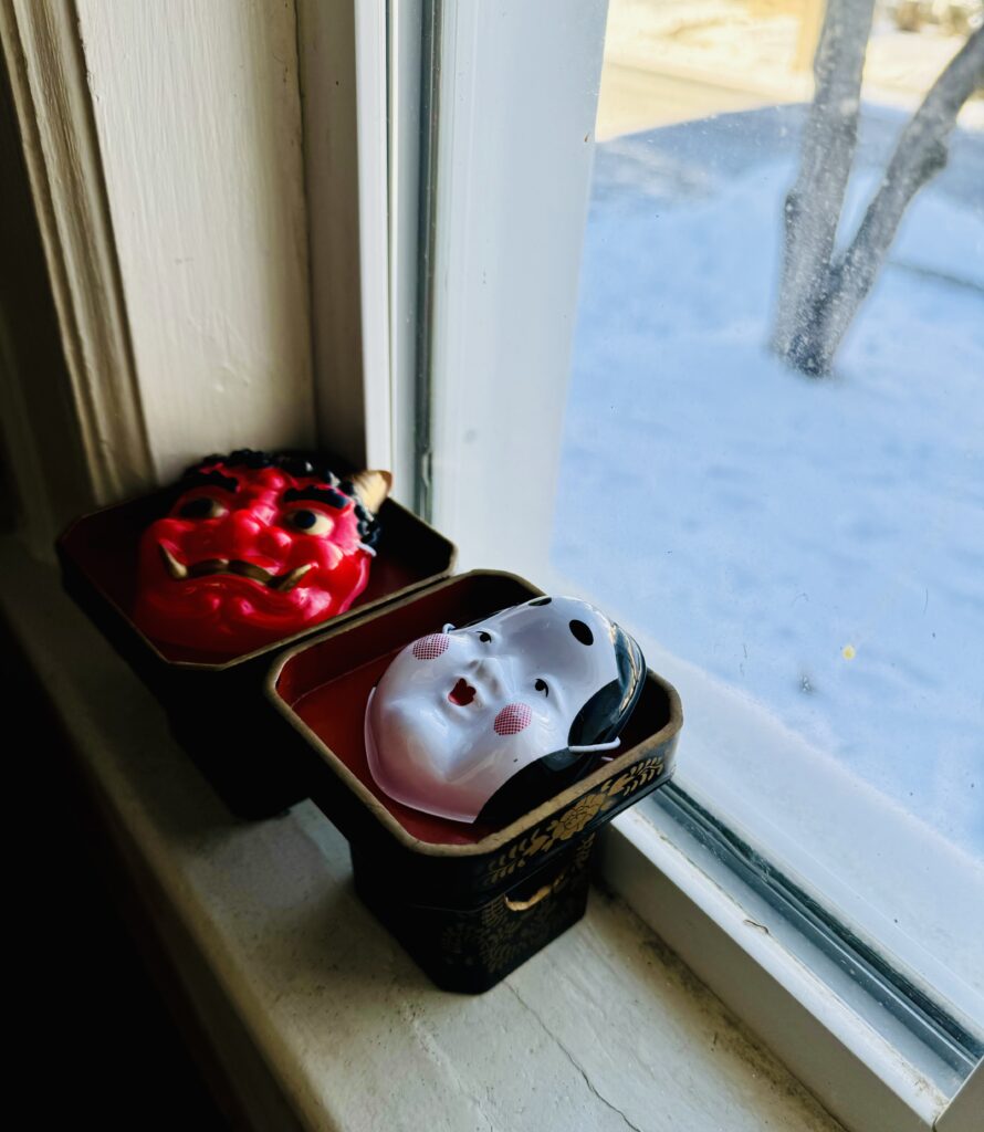 鬼とおたふくの小さいお面を三包に載せて。 お面は豆まき用の豆を買ったときについてたものを大事にとっておいたものです。