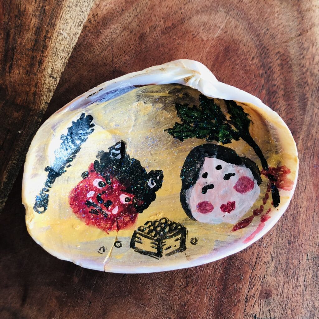 ニューイングランド名物、クラムケーキを食べた後の貝の殻にアクリル絵の具で描いた鬼とオタフク描いた貝殻も。