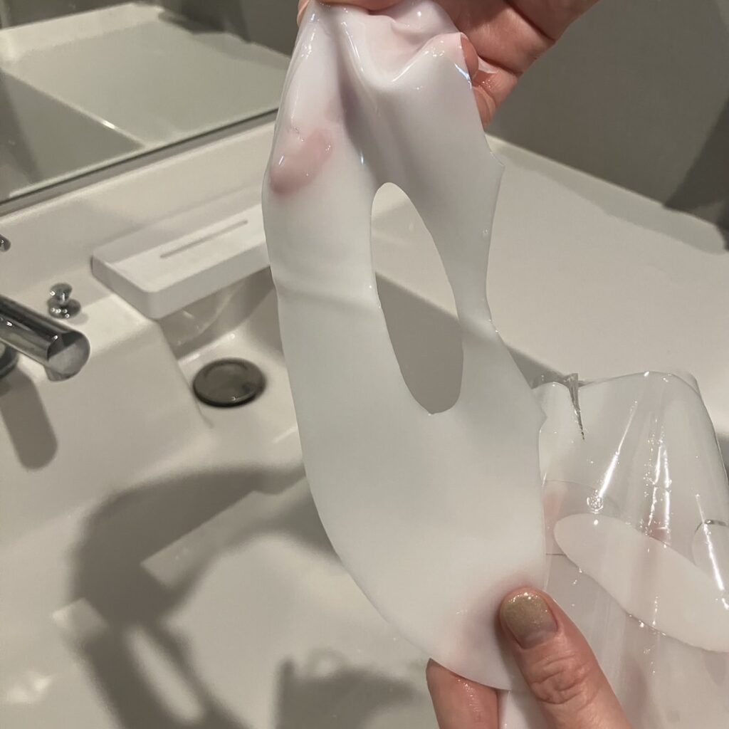 こちら使用前、顔の下半分を広げた写真になります。びよ〜ん。調子に乗ってびよ〜んしてると…破れるから気をつけて!期待感しかないプルプル具合です。