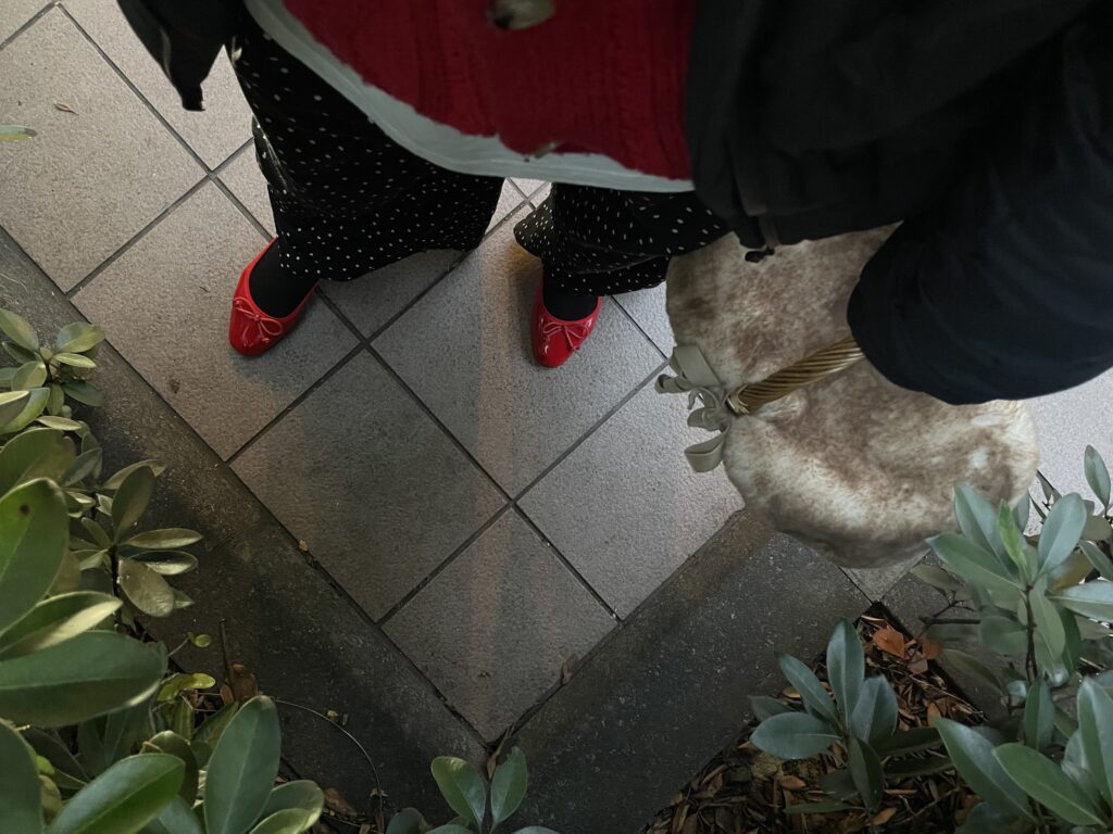 いつかのユニクロの真っ赤なカーディガンと、いつかのGUのドットパンツでお邪魔して来ました。
