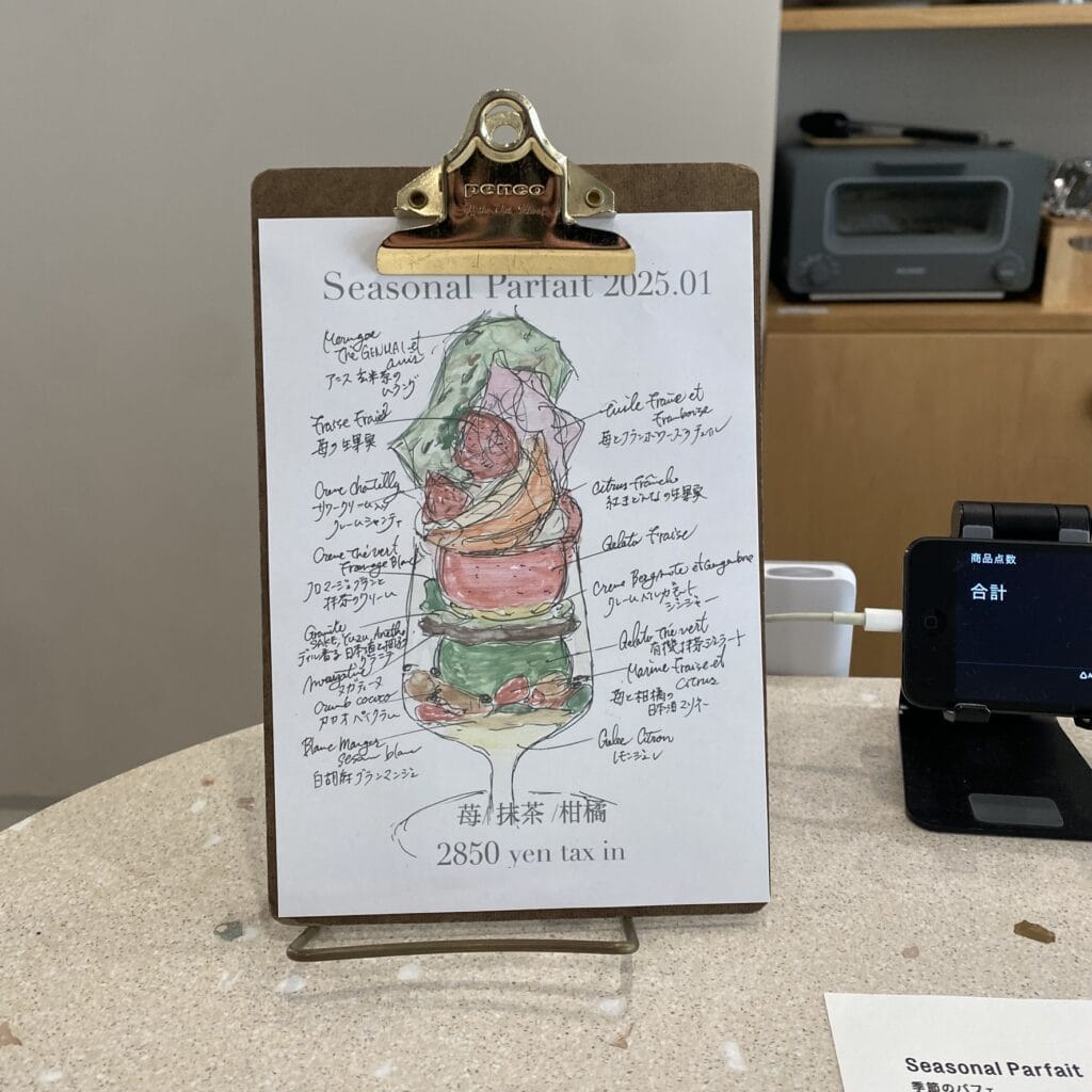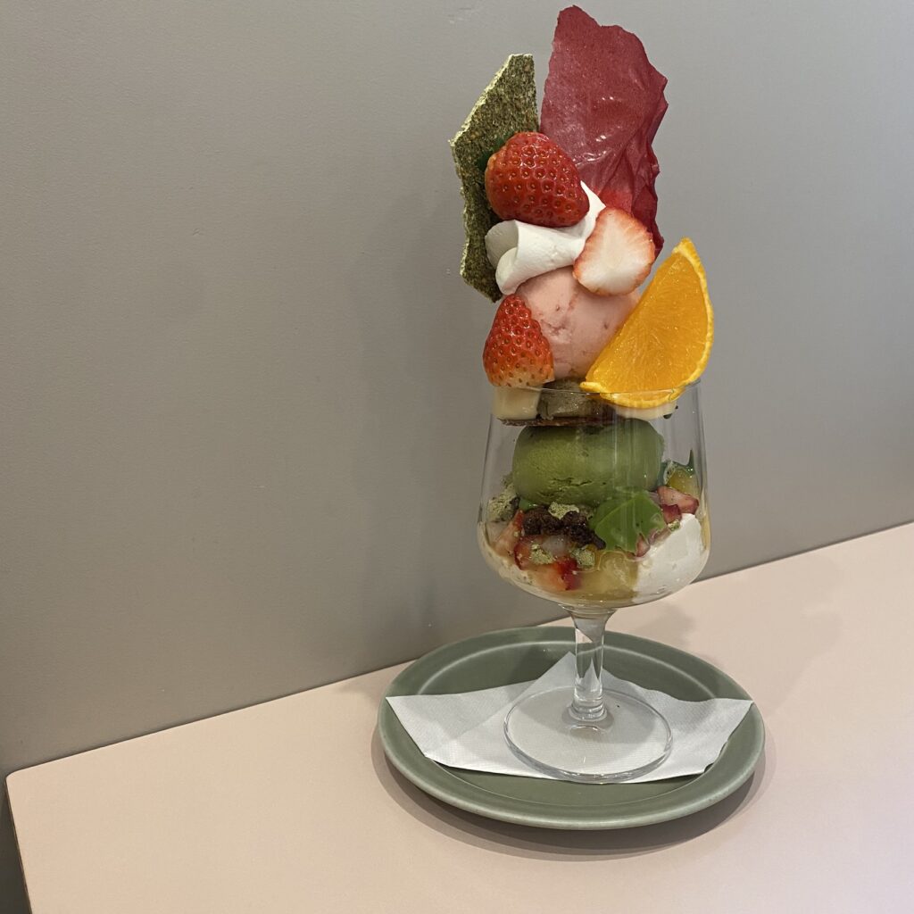 ここでも仲良く季節のパフェ&ペアリングドリンクのセットを注文。苺と抹茶、柑橘のパフェなんて、