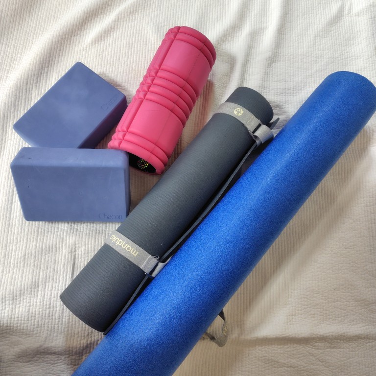 左からヨガブロック✕2、フォームローラー、ヨガマット、ストレッチポールです。(ストレッチポール、カバーの劣化により芯が剥き出しの状態で、もうほぼ使ってないのですが、サイズ感だけでも感じていただければ…。)