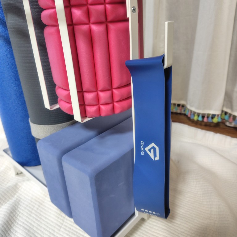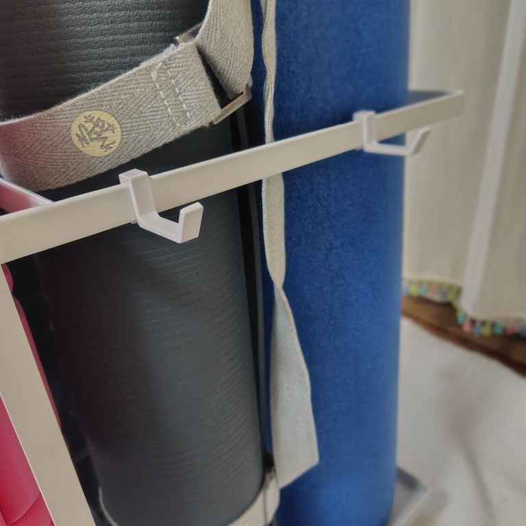 実際に使われている方の感想も調べてみると、「ヨガマットが収まらなかった」というお話を見かけましたが、きっとよほど厚いか、緩く巻かない限りはだいたいのヨガマットが立てられそうかなと、私の感想です。