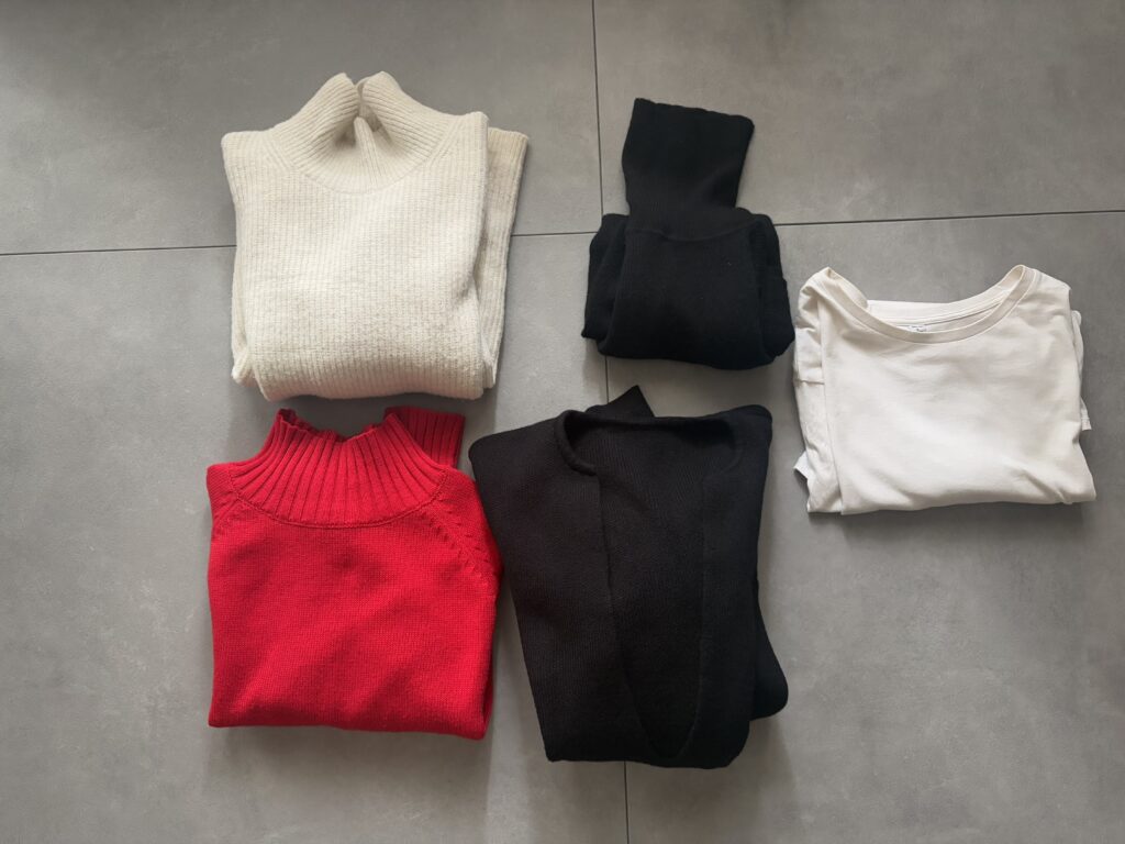白タートル、黒タートル、赤ニット、キーネック黒ニット、ロンTの5着。