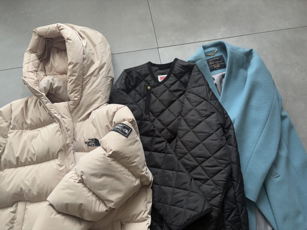 ノースフェイスのダウンとトラディショナルウェザーウェアのライトダウン、IENAの水色のウールのコートです。アウターは高くても上質なものを選ぶようにしています。
