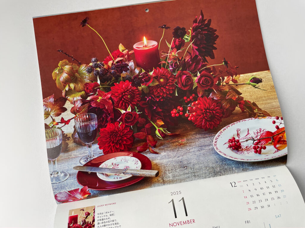 あとは、10月と11月。11月は感謝祭のテーブルの中心にあるキャンドルリースのイメージでしょうか…。一緒にスタイリングされているサラグミンヌのプレートも素敵過ぎる…。