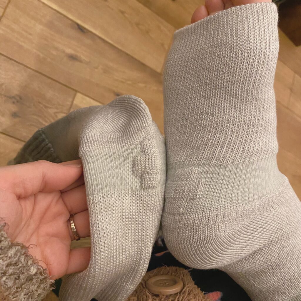 わたしのお気に入りポイントはかかとにある『+』マーク。発熱素材で温めてくれるのですが、失眠穴というツボがあるそうで、快眠のツボだそうです。履くときにも良い目印になっています。