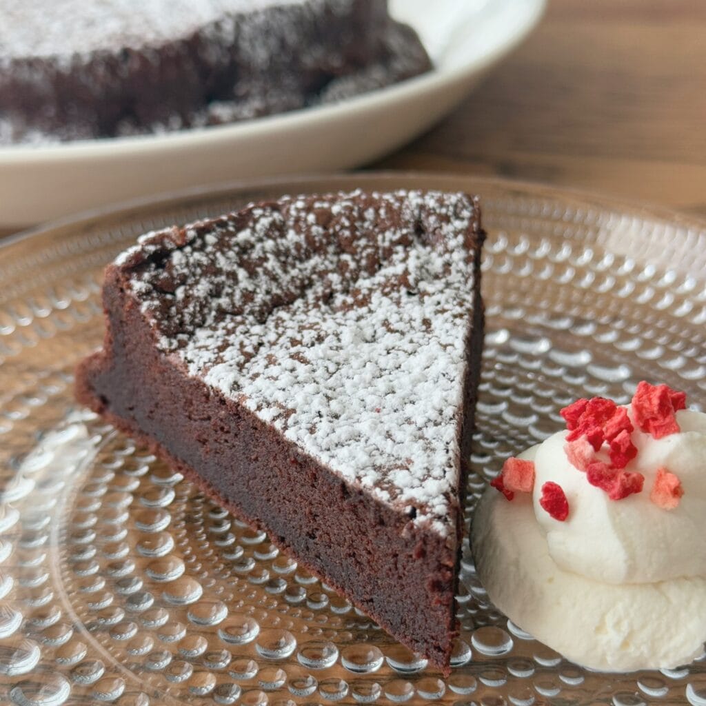 ガトーショコラはシンプルにいただきたかったのでフルーツなどは乗せず、粉砂糖をささっとかけて。食べる時に生クリームとドライいちごをパラパラっと♩