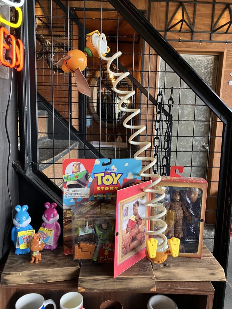 遊び心いっぱいの店内は楽しい空間でした。息子たちが愛してやまないTOY STORYグッズがいっぱい!もちろん我が家のお気に入りはスリンキー!ぶらさがってるのがかわいかった♡